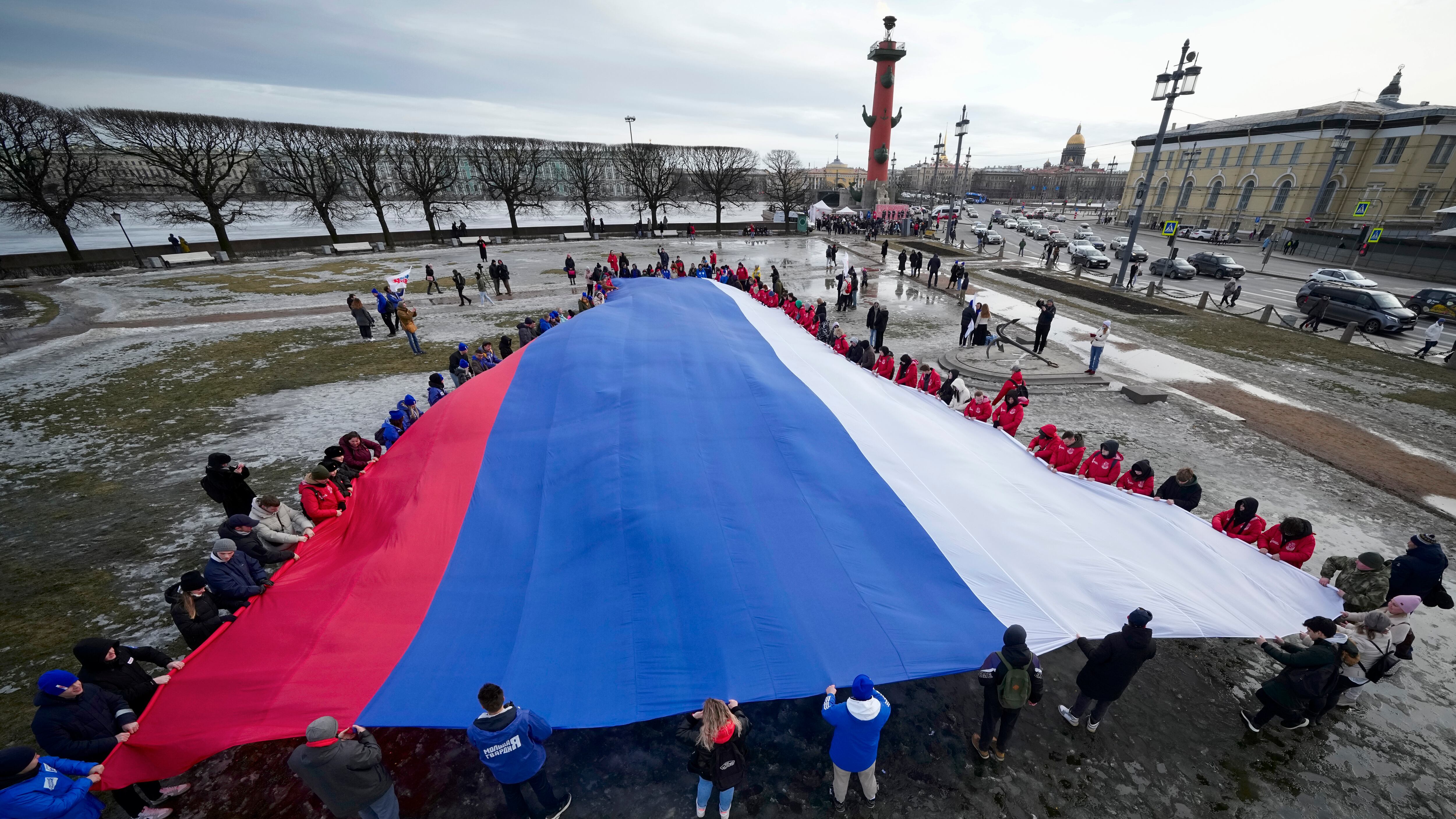 Activistas despliegan una enorme bandera rusa para conmemorar el noveno aniversario de la anexión rusa de la península ucraniana de Crimea, en San Petersburgo, Rusia, el 18 de marzo de 2023. (Foto AP /Dmitri Lovetsky) AP (Dmitri Lovetsky/AP)