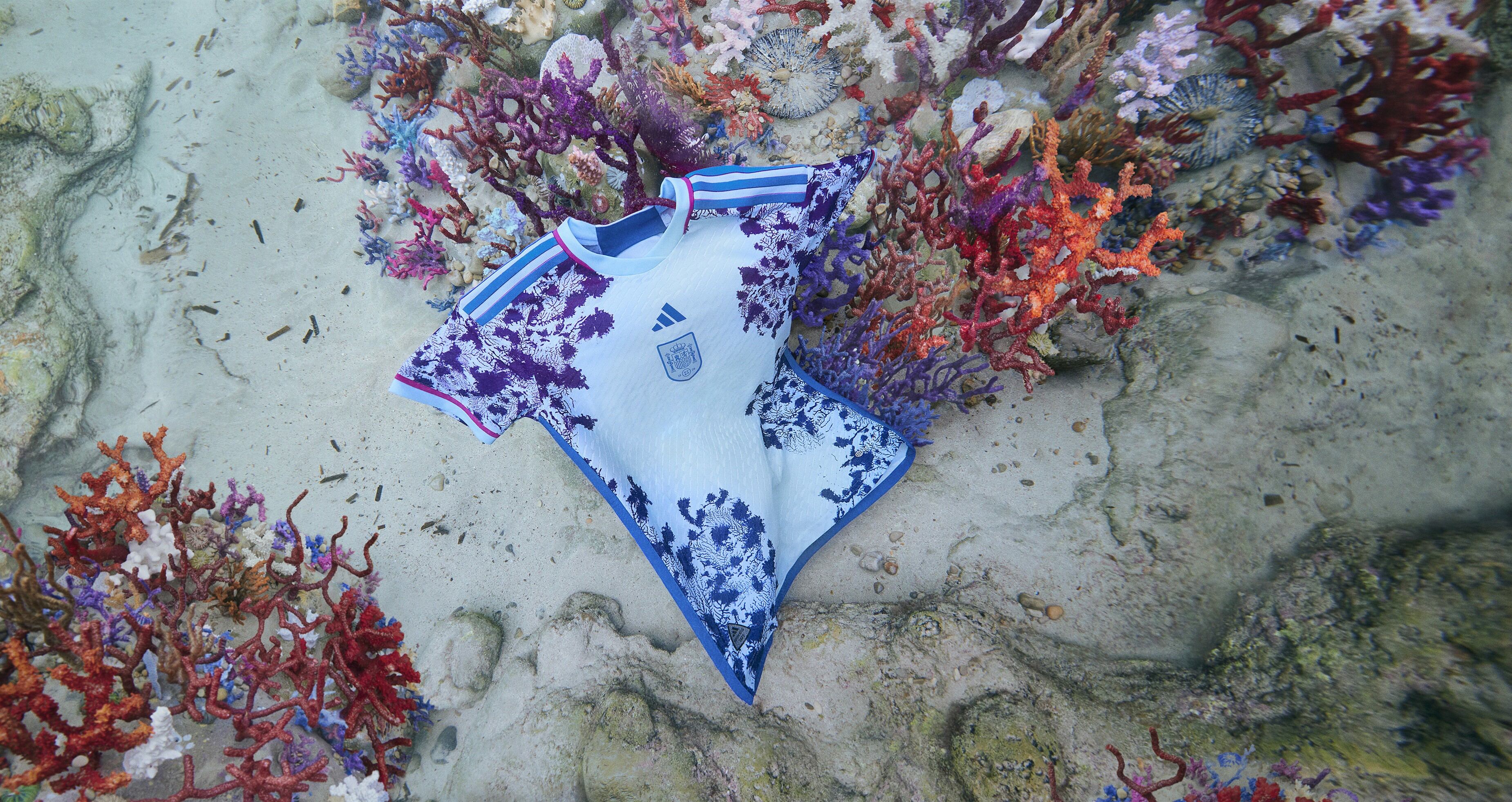 En cuanto a la camiseta de la segunda equipación de la selección española, se inspira en los "preciosos arrecifes de coral" que cubren la extensa línea de costa del país, una singularidad que comparte con los célebres arrecifes de coral de los países anfitriones del torneo, Australia y Nueva Zelanda.