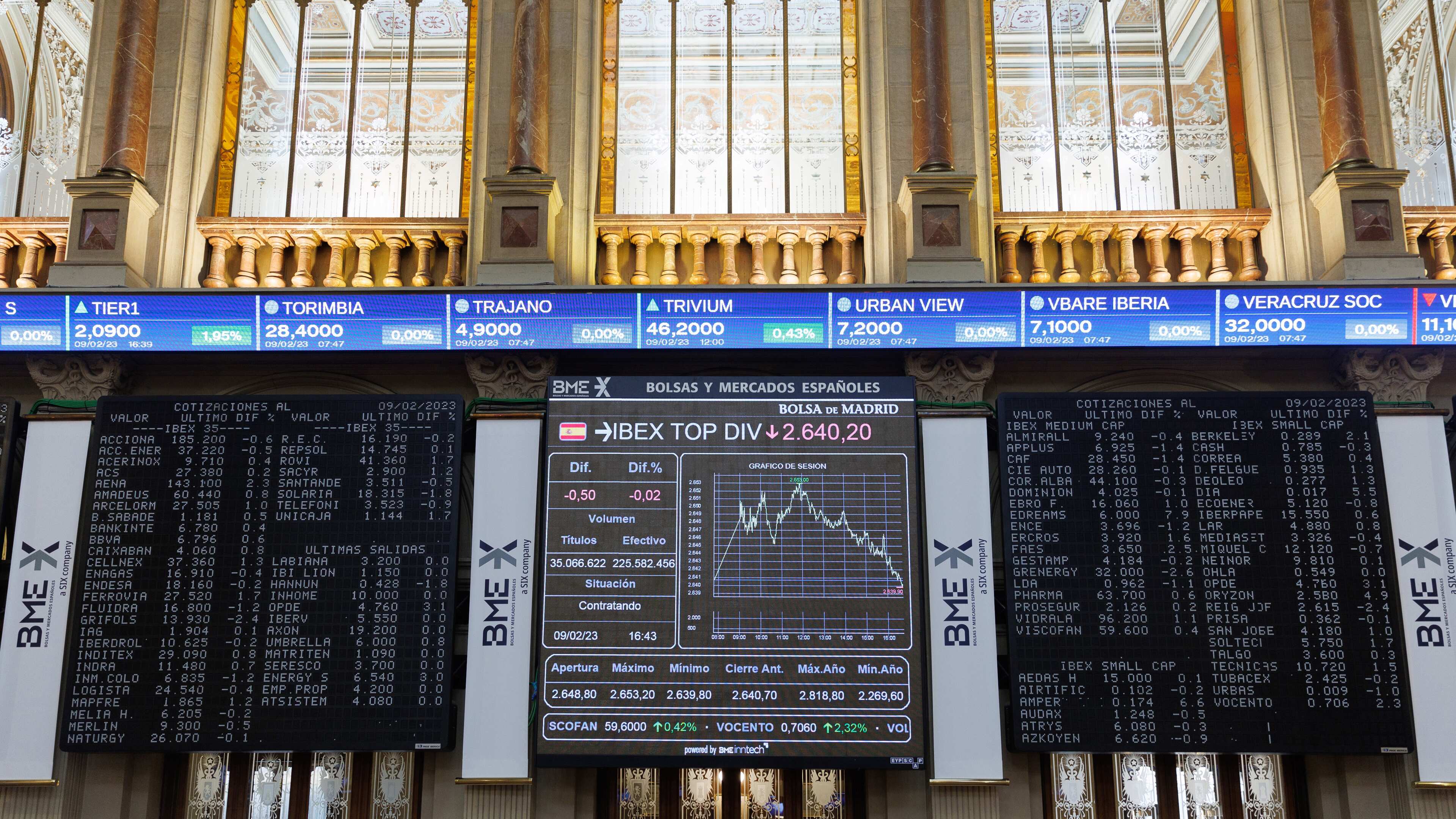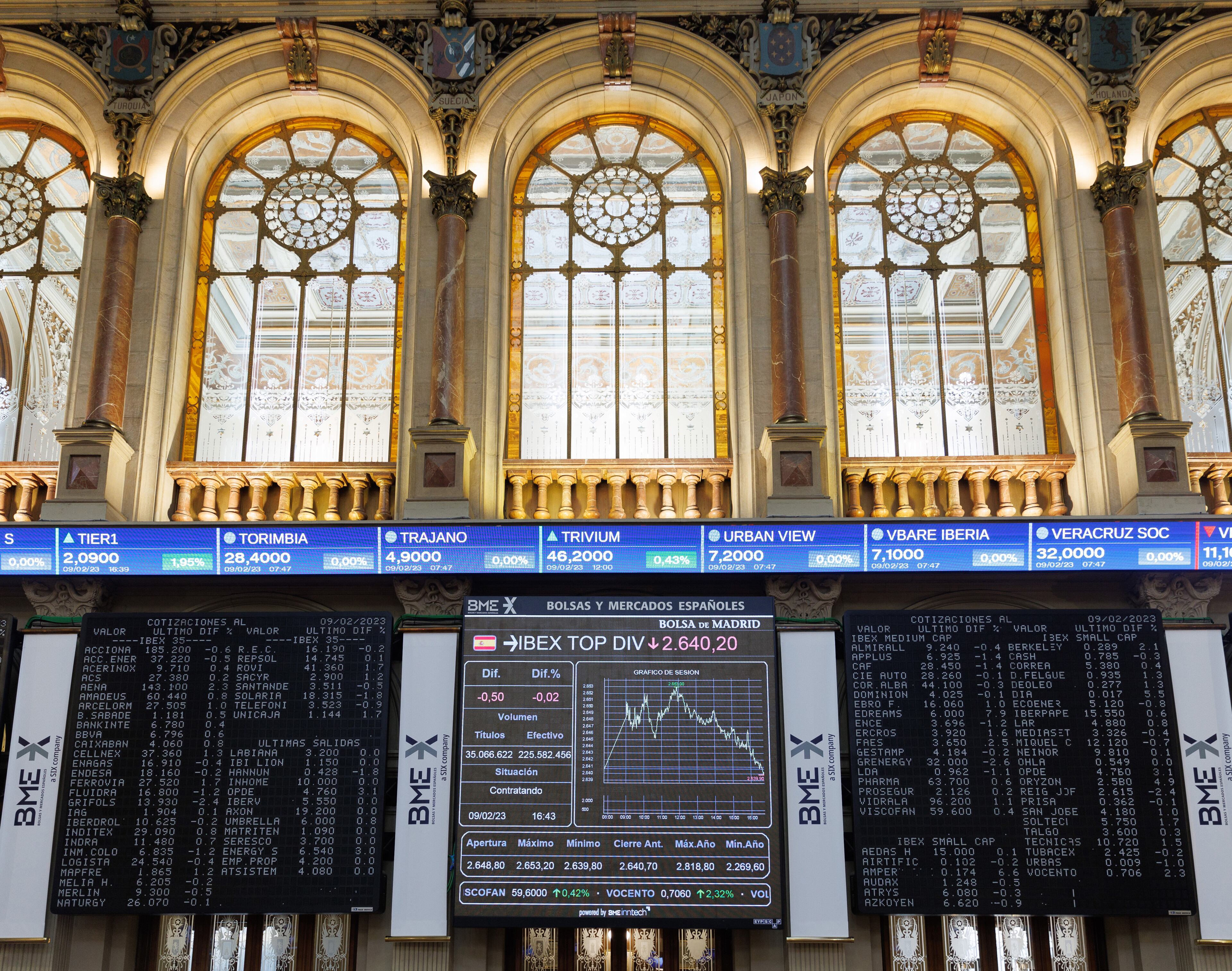 Archivo - Un panel del Ibex 35 en el Palacio de la Bolsa, a 9 de febrero de 2023, en Madrid (España). El principal indicador de la Bolsa española, el Ibex 35, sube el 0,52% a media sesión, en una jornada marcada por la presentación de resultados empre Eduardo Parra - Europa Press - Archivo