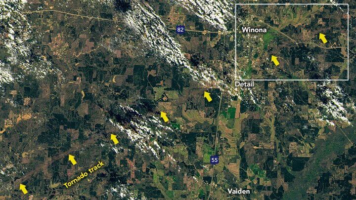 Los fuertes tornados provocados por potentes tormentas eléctricas que barrieron Mississippi y Alabama el 24 de marzo dejaron una huella en el territorio que incluso se aprecia desde el espacio