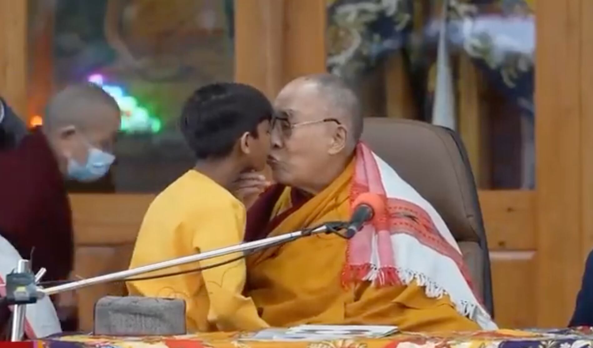 El Dalai Lama invitó al niño a la plataforma donde estaba sentado. En el video, señala hacia su mejilla, tras lo cual el niño lo besa y lo abraza.
