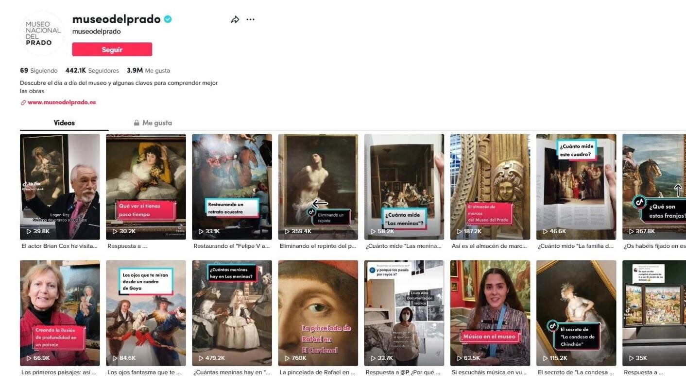 El Museo del Prado en TikTok suma en abril de 2023 más de 442.000 seguidores en TikTok, manteniendo la primera posición como museo de arte más seguido en esta plataforma en todo el mundo, según el ranking publicado por The Art Newspaper: Revealed: the top 20 most popular art museums on social media in 2023.