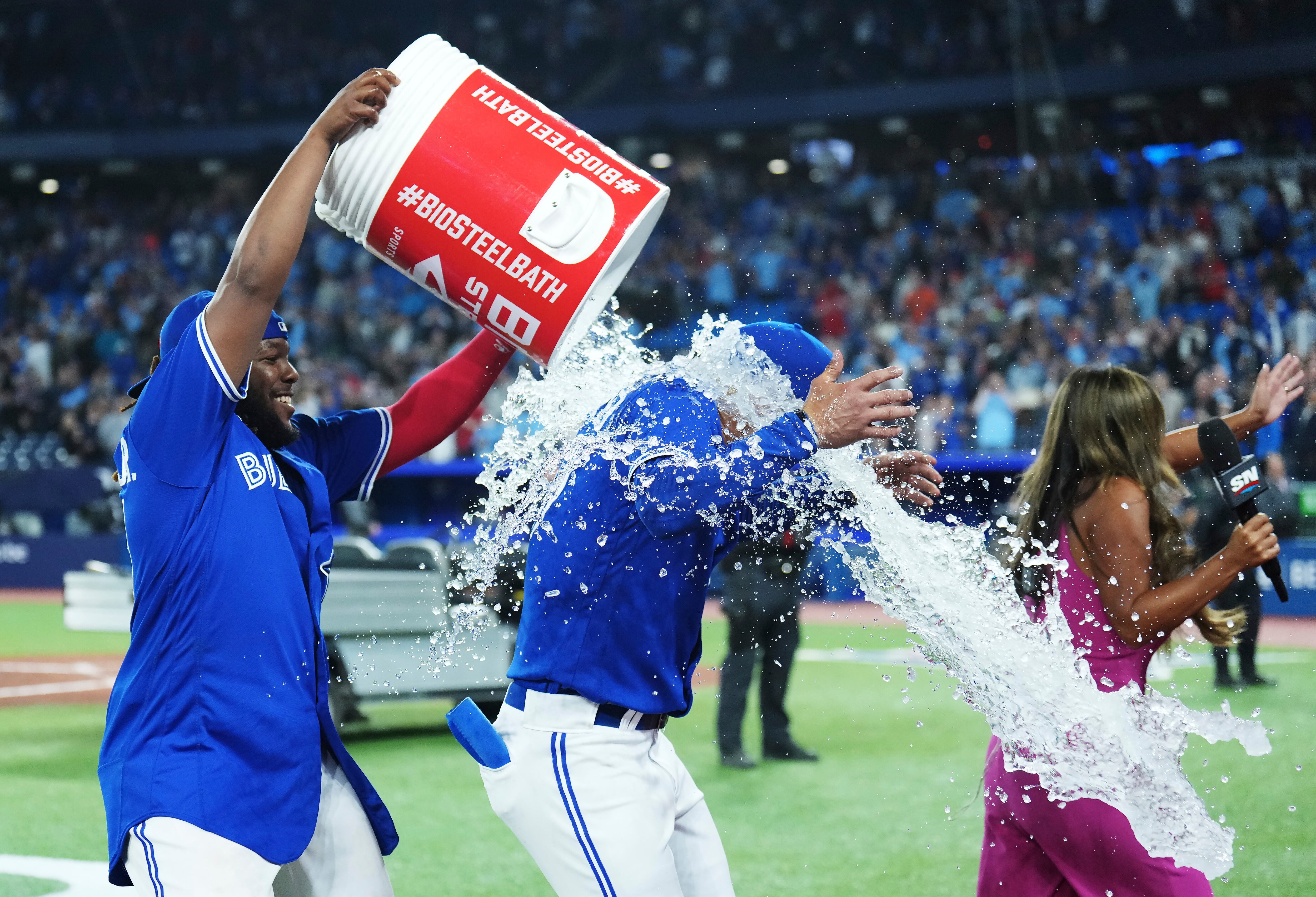 Por los Azulejos, los dominicanos Vladimir Guerrero de 4-0. El mexicano Kirk de 4-2 con una anotada y cuatro empujadas.