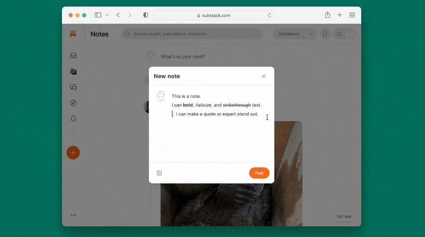Para publicar una nota, se debe acceder a la pestaña que indica su nombre y añadir imágenes, texto, enlaces e, incluso, menciones a otros usuarios, y pulsar el botón 'Publicar', del mismo modo que en Twitter. Una vez hecha, los usuarios pueden invitar a los suscriptores de sus boletines a unirse a estas conversaciones.