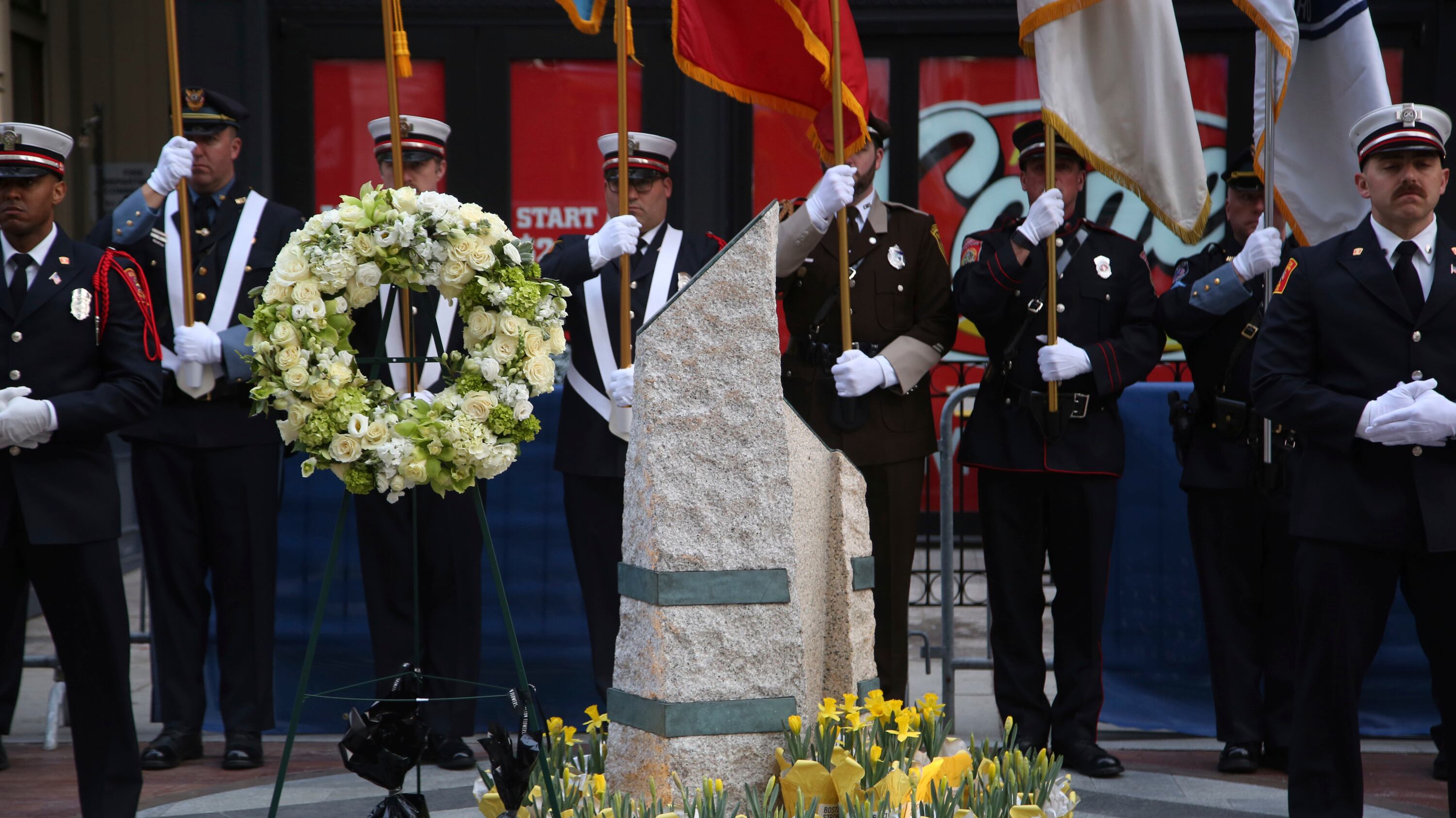 La alcaldesa de Boston Michelle Wu, quien era candidata al gobierno local cuando ocurrió el atentado, participó en la procesión con la gobernadora Maura Healey. En cada memorial —marcado con tres pilares por las tres víctimas— se detuvieron en silencio con los familiares. Más tarde se llevará a cabo una ceremonia en la línea de meta, en donde sonarán campanas seguido de un minuto de silencio.