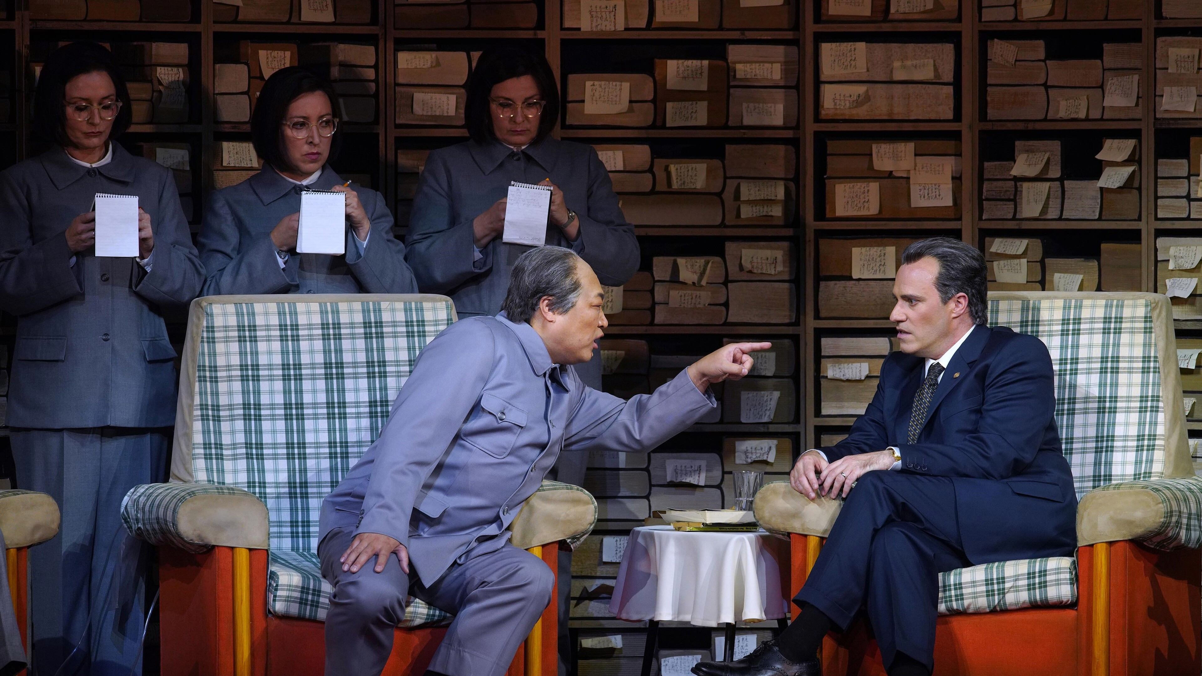 Los personajes de 'Nixon en China' también cuentan con un toque excéntrico, como las secretarias de Mao Zedong, la cuales repiten todo lo que dice su líder en un tono más bajo e incluso se adelantan a lo que pronuncia, con el objetivo de que el líder no se salga del discurso oficial.