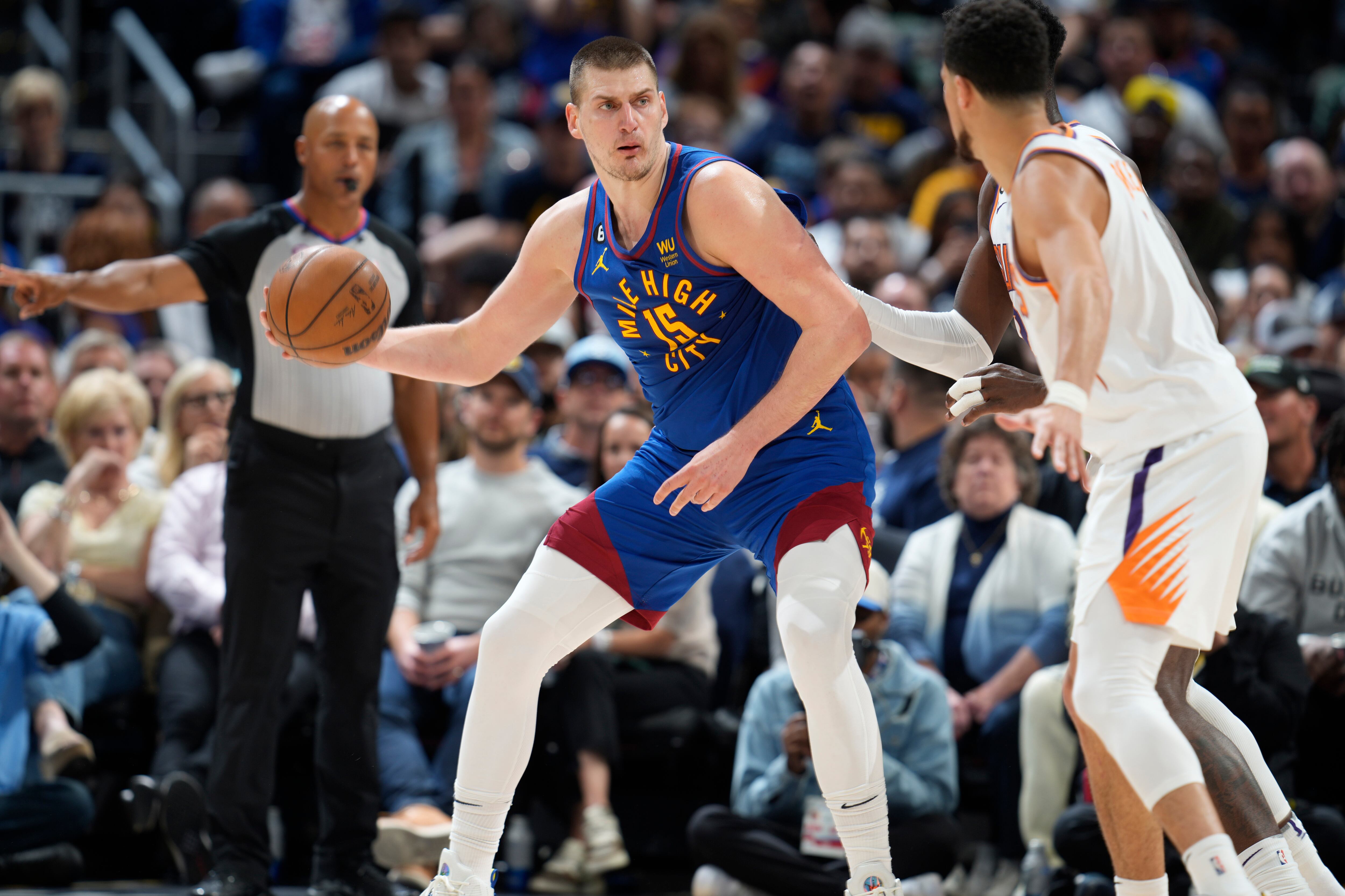 El serbio Nikola Jokic, de los Nuggets de Denver, busca enviar un pase frente a Devin Booker, de los Suns de Phoenix, en el encuentro de playoffs disputado el sábado 29 de abril de 2023 (AP Foto/David Zalubowski) AP (David Zalubowski/AP)