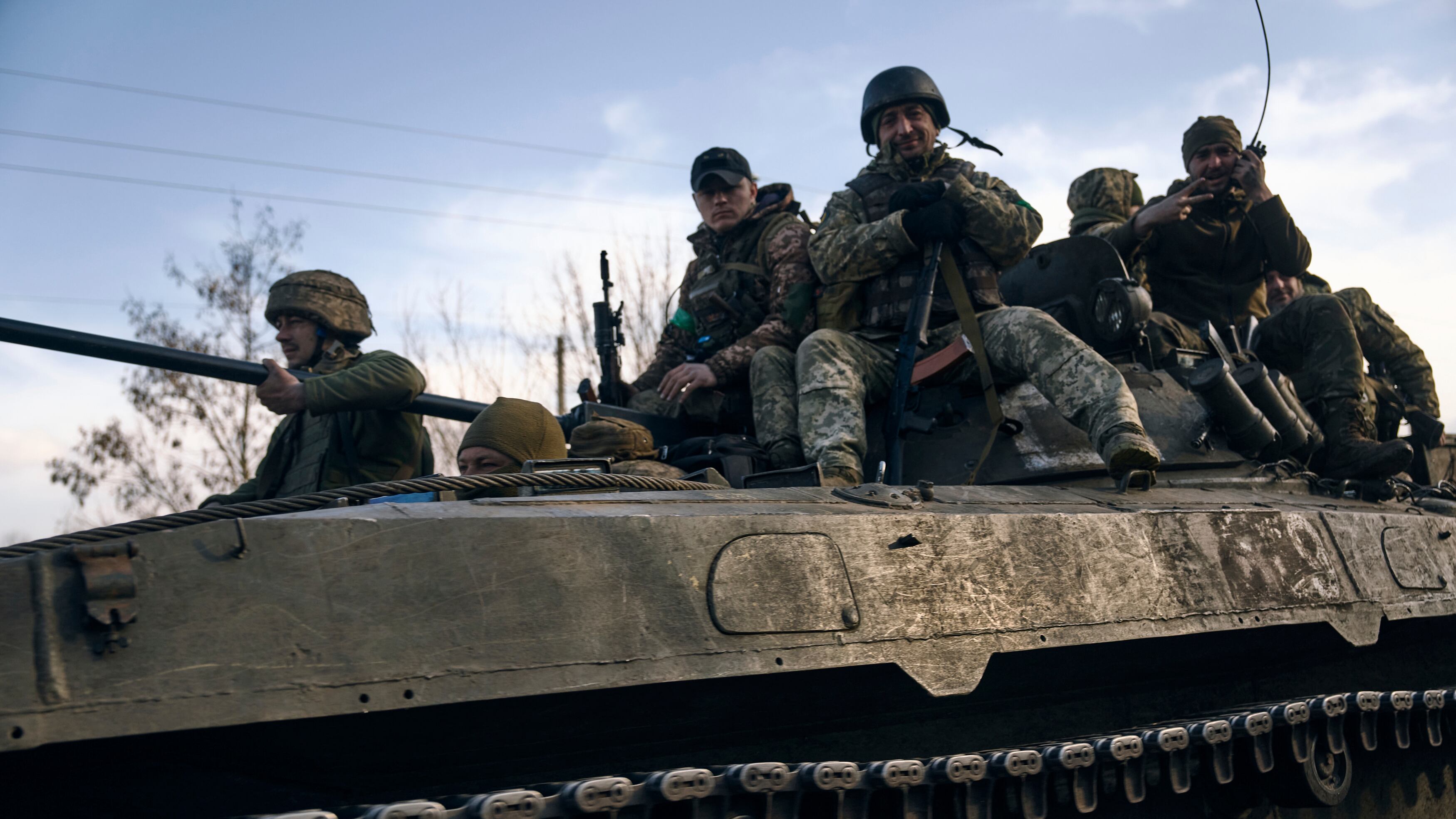 Soldados ucranianos en un vehículo blindado en Ucrania. (AP Foto/Libkos) (LIBKOS/AP)