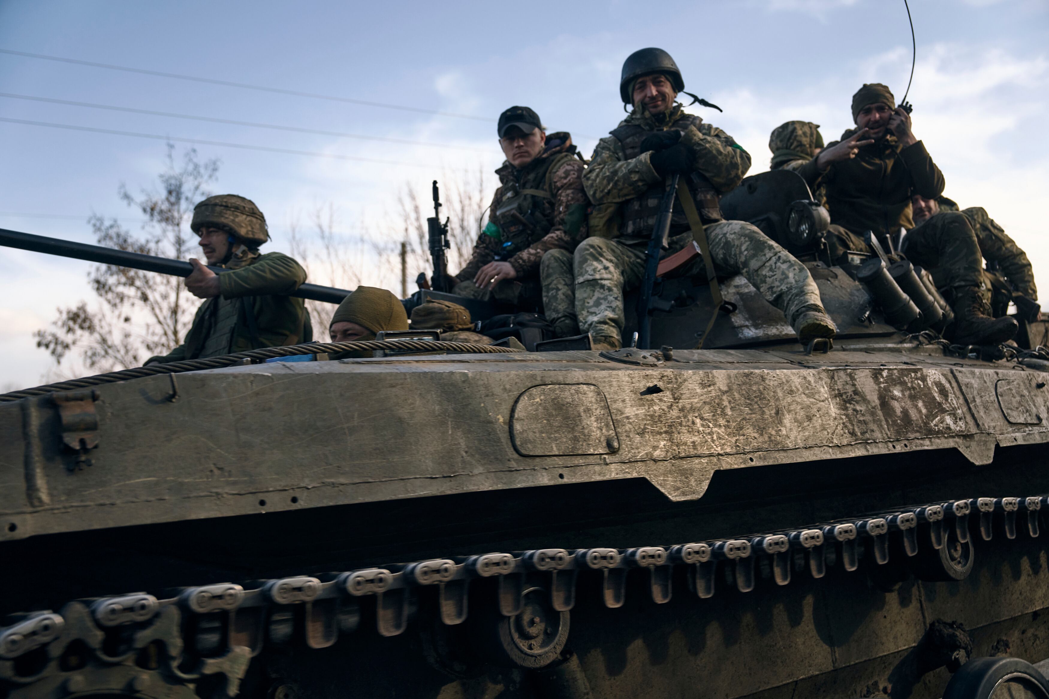 Soldados ucranianos en un vehículo blindado en Ucrania. (AP Foto/Libkos) (LIBKOS/AP)