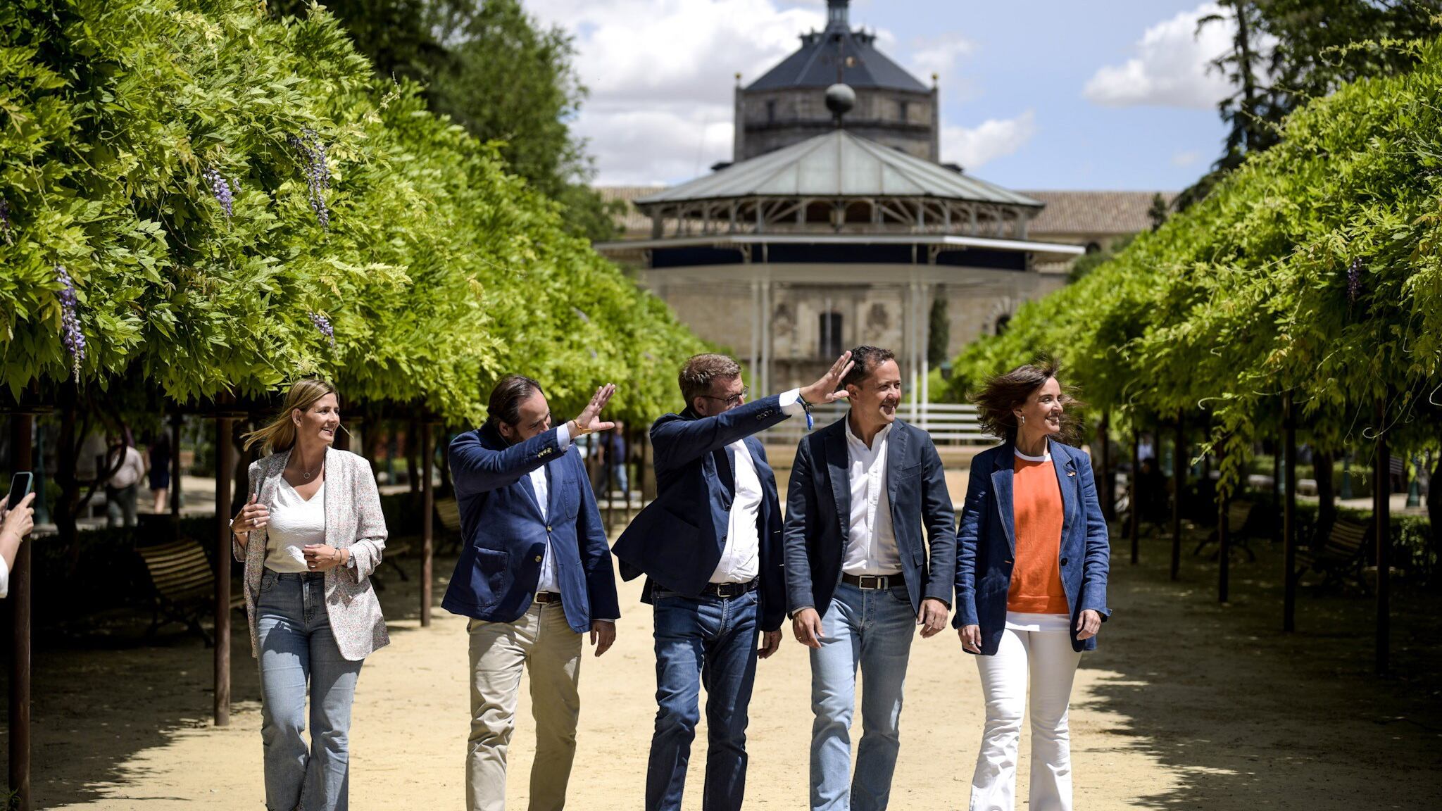 En un acto en el Parque de la Vega, con vistas a la muralla, donde ha arropado al candidato a la Presidencia de la región, Paco Núñez, y el candidato a la Alcaldía de Toledo, Carlos Velázquez, Feijóo ha recalcado que con ese viaje de Sánchez a Estados Unidos "los socialistas se han librado de Sánchez en sus mítines".