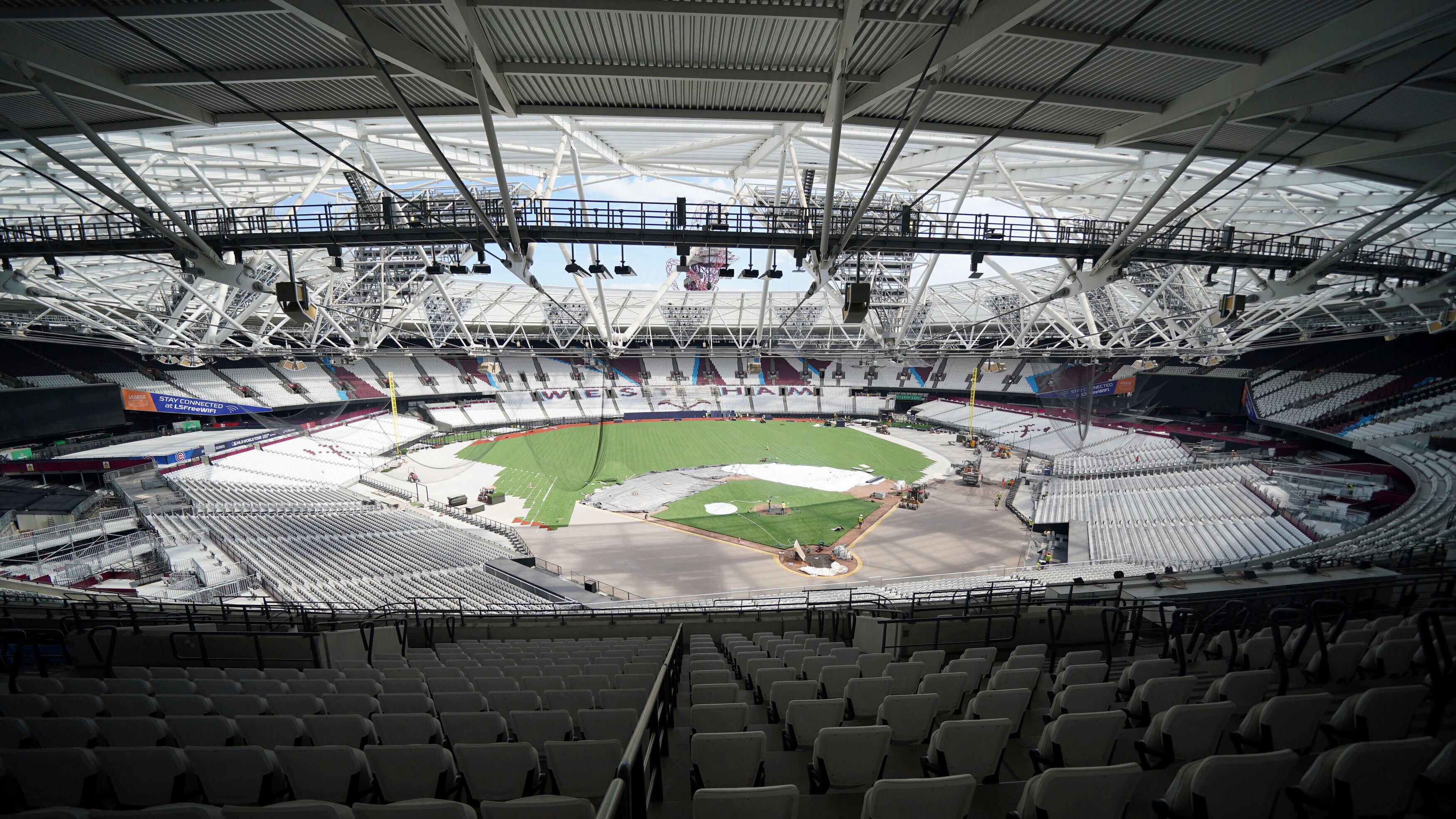 Una vista general del London Stadium, casa del West Ham United, mientras se transforma el terreno de juego en un diamante de béisbol, el jueves 15 de junio de 2023. (Lucy North/PA vía AP) AP (Lucy North/AP)