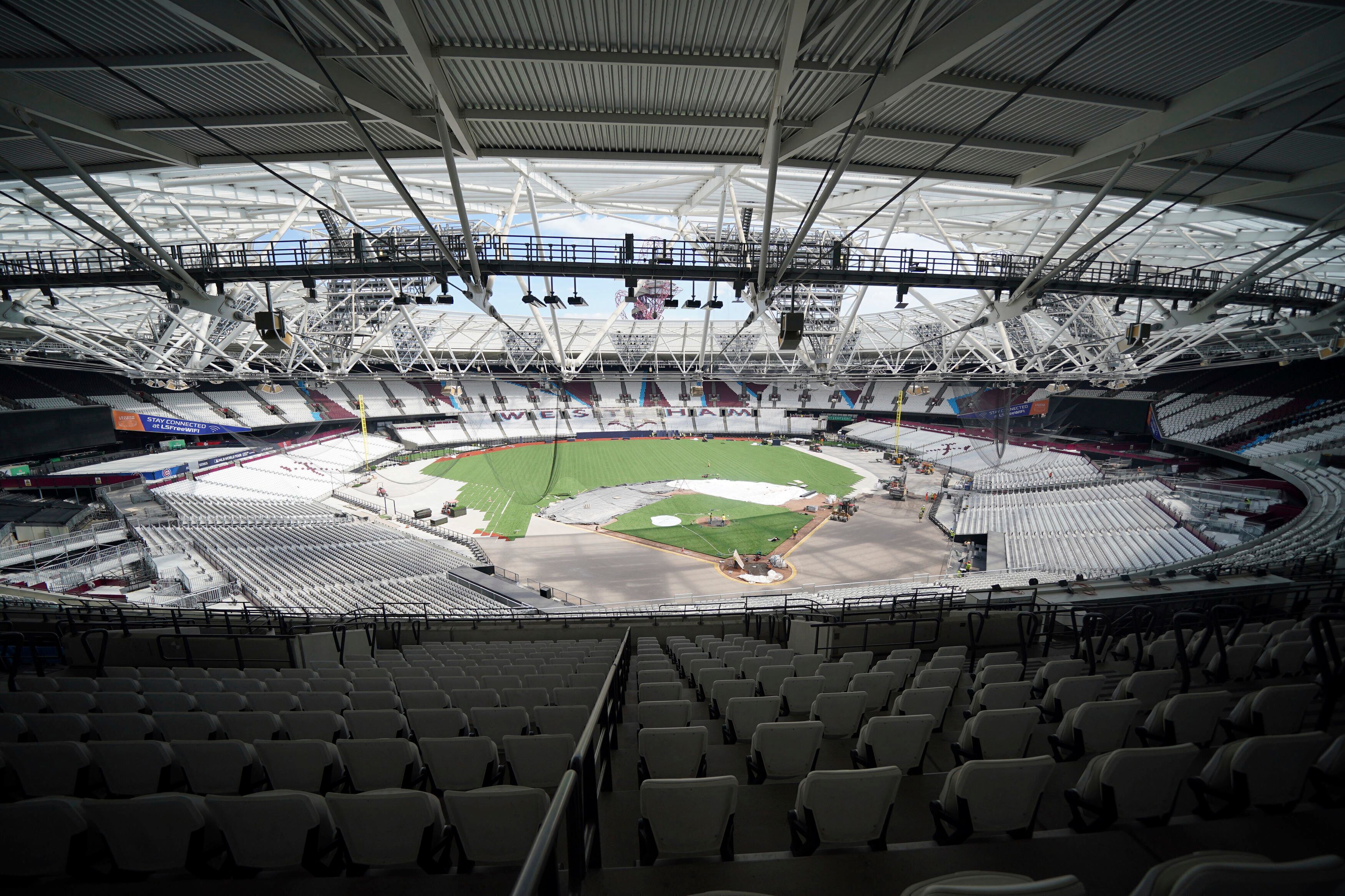 Una vista general del London Stadium, casa del West Ham United, mientras se transforma el terreno de juego en un diamante de béisbol, el jueves 15 de junio de 2023. (Lucy North/PA vía AP) AP (Lucy North/AP)