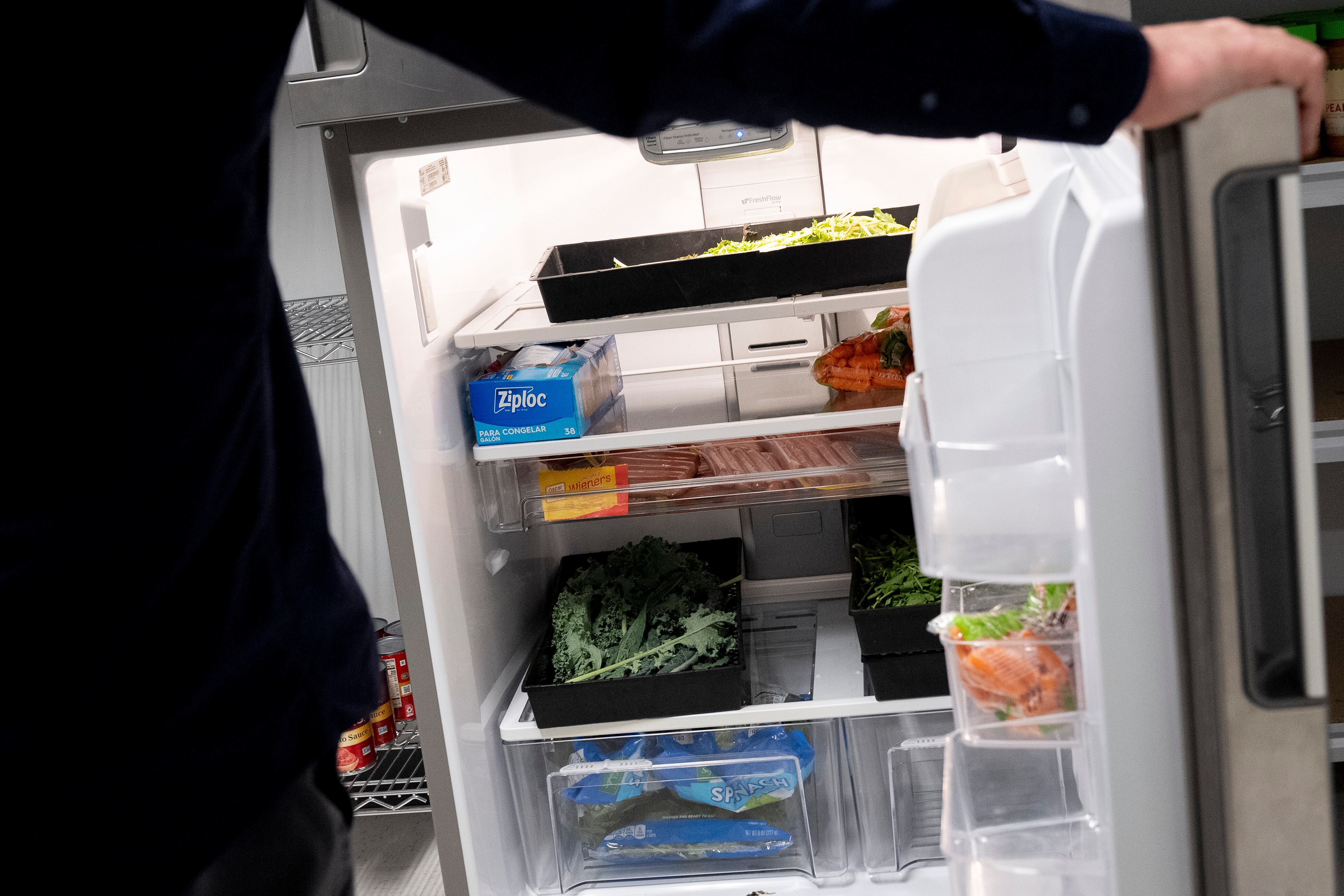 Una persona abre la puerta de una nevera en la que hay varios alimentos para estudiantes necesitados y que forman parte de una despensa de alimentos Hoya Hub en el campus de la Universidad de Georgetown el 9 de junio de 2023, en Washington, D.C. (AP Foto/ AP (Andrew Harnik/AP)