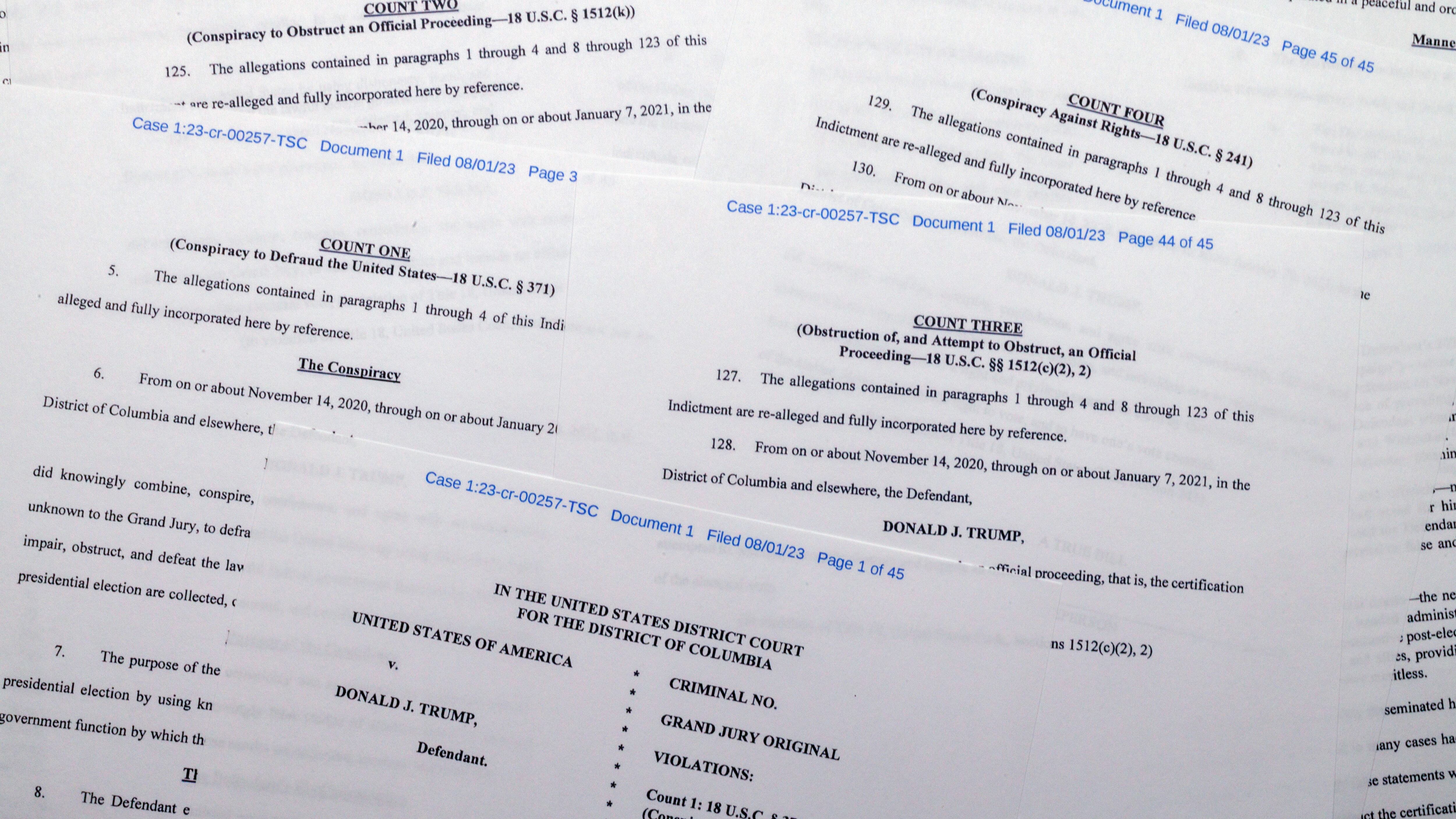Trump está acusado de cuatro cargos: Obstrucción de un procedimiento oficial, conspiración para obstruir un procedimiento oficial, conspiración para defraudar a Estados Unidos y conspiración para impedir que otros ejerzan sus derechos constitucionales.