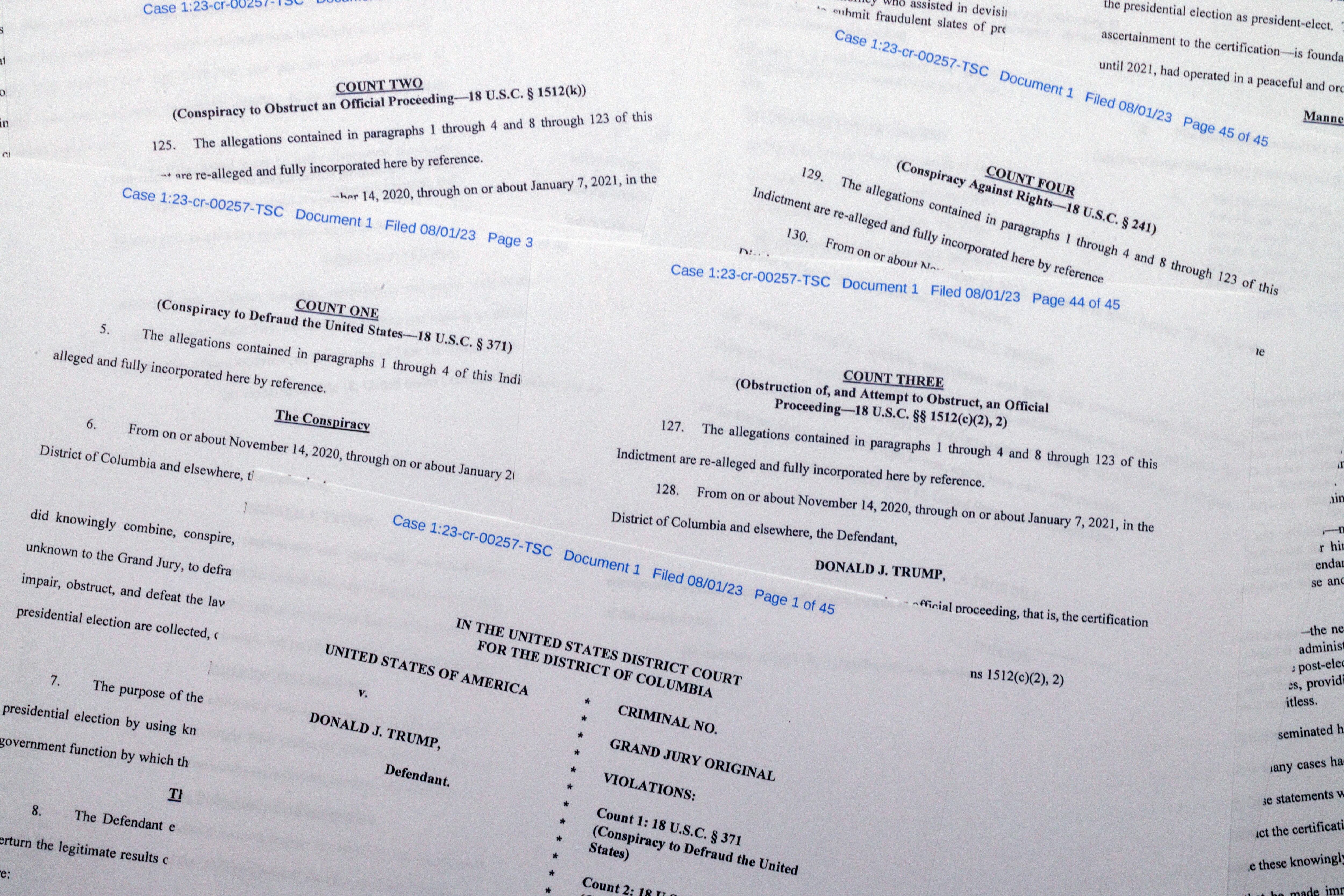 Trump está acusado de cuatro cargos: Obstrucción de un procedimiento oficial, conspiración para obstruir un procedimiento oficial, conspiración para defraudar a Estados Unidos y conspiración para impedir que otros ejerzan sus derechos constitucionales.