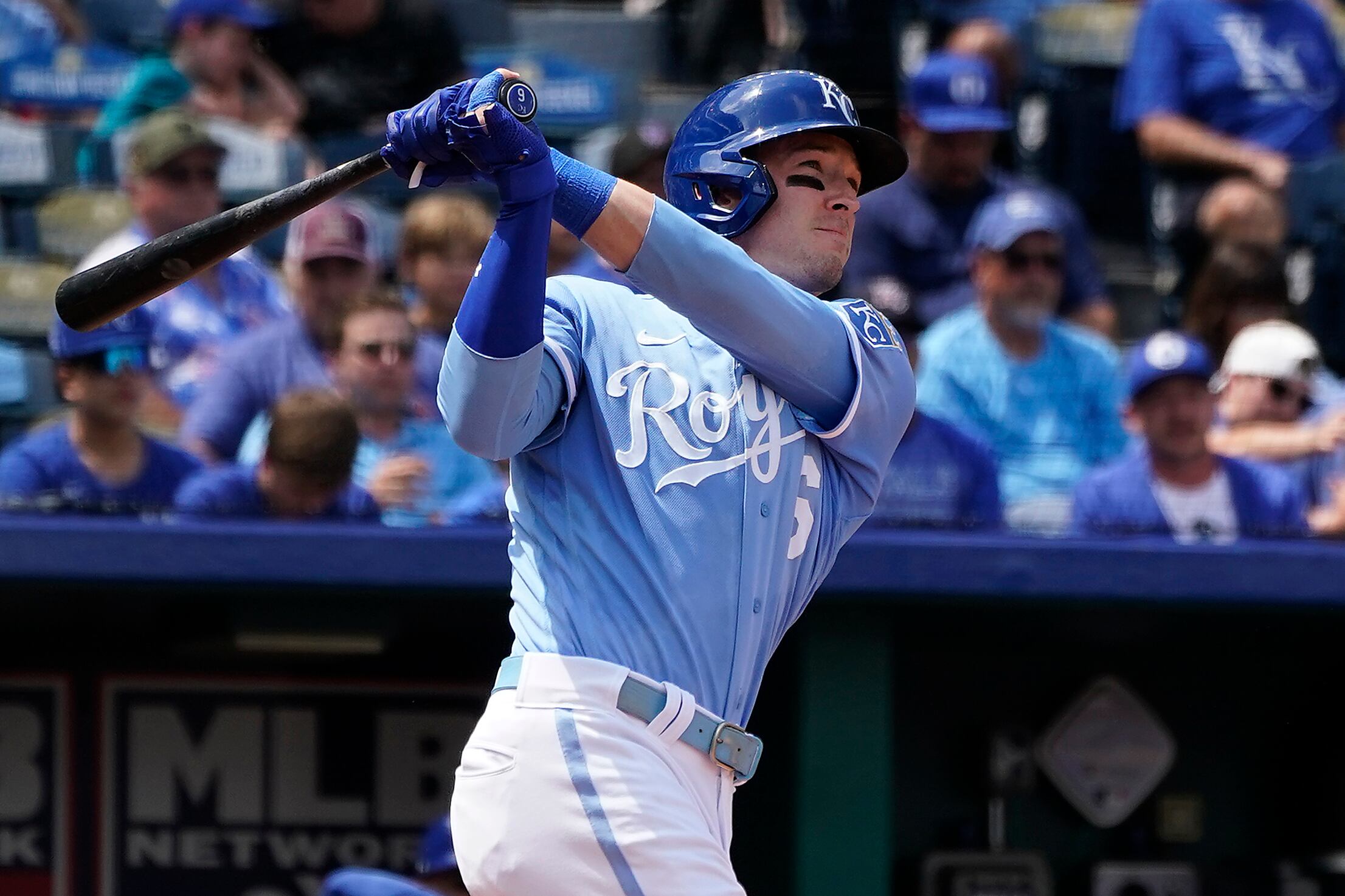 Por los Reales, los venezolanos Maikel García de 3-2, una impulsada; Salvador Pérez de 4-1, una impulsada; y Freddy Fermín de 4-2, dos anotadas.