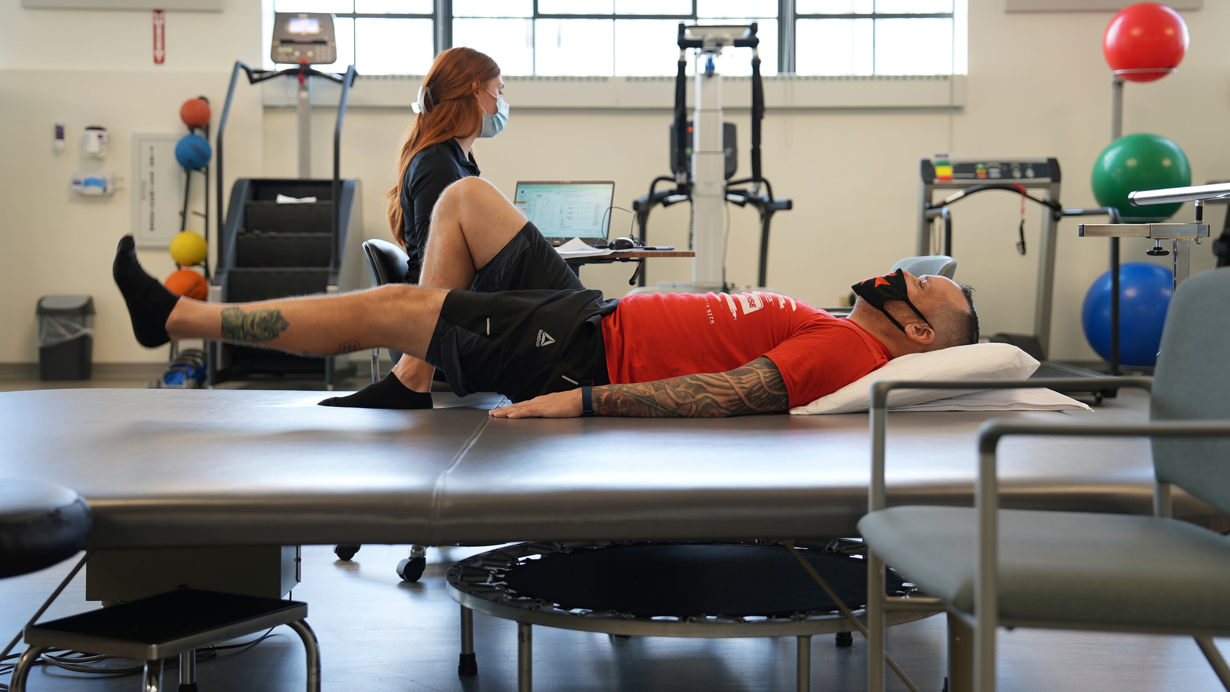 De vuelta en el gimnasio, Hughes, una terapista física que trabaja con pacientes que padecen COVID largo, presentó un cuidadoso plan de rehabilitación después de que la prueba en la caminadora reveló picos erráticos en el ritmo cardiaco de Camilleri.