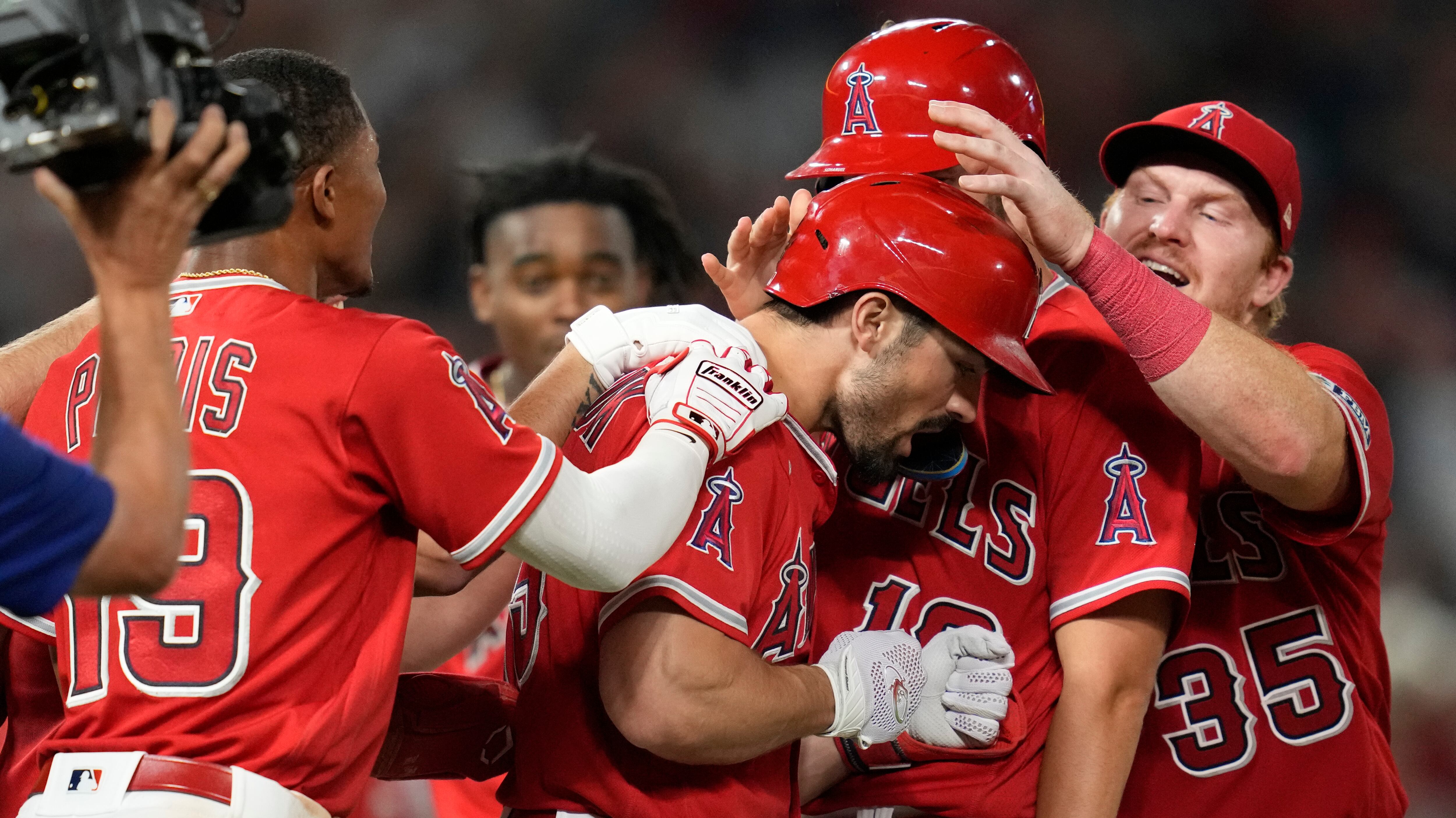 Randal Grichuk (centro) festeja con los Angelinos de Los Ángeles luego de batear un sencillo que significó el triunfo sobre los Guardianes de Cleveland, el jueves 7 de septiembre de 2023 (AP Foto/Ashley Landis) AP (Ashley Landis/AP)