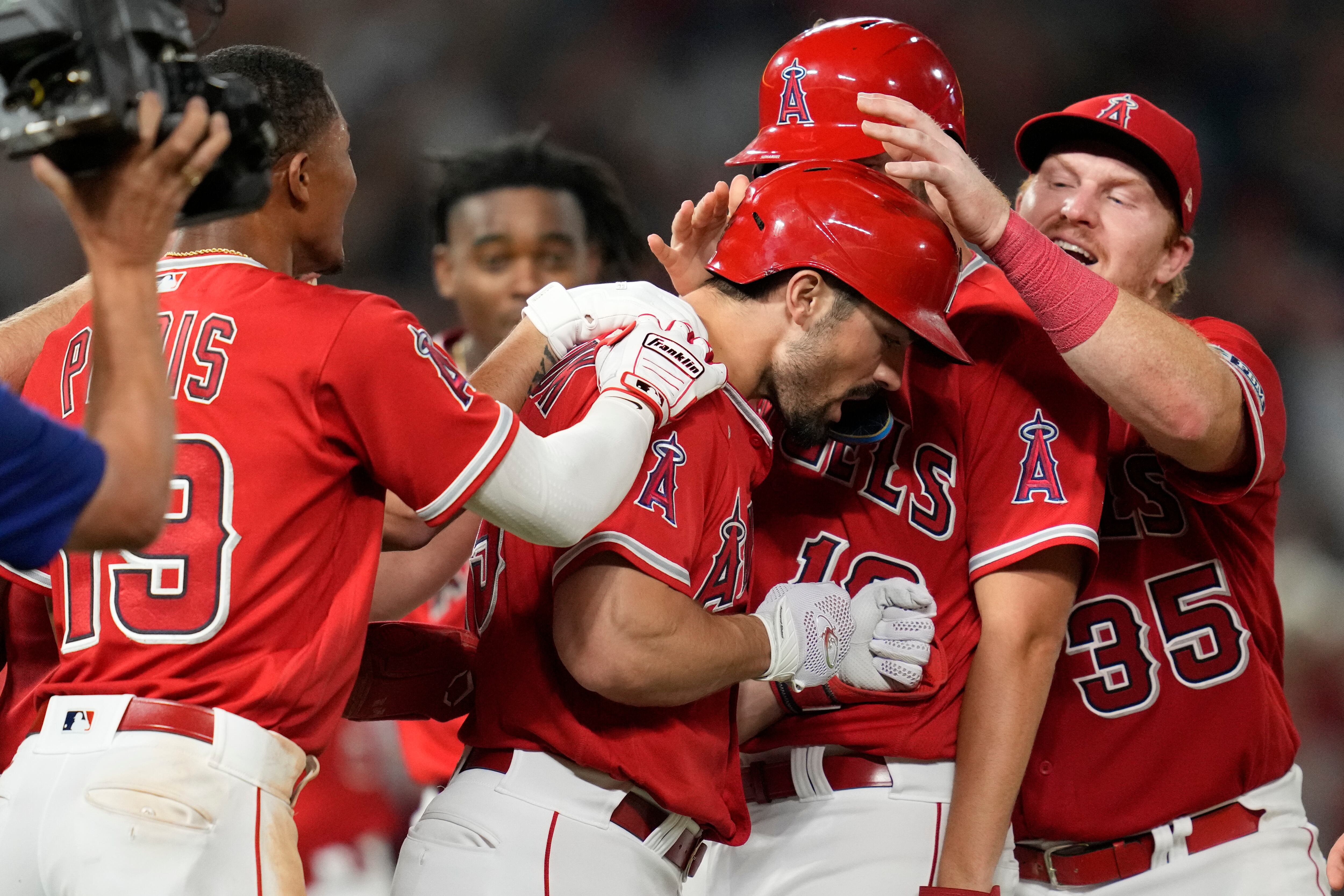 Randal Grichuk (centro) festeja con los Angelinos de Los Ángeles luego de batear un sencillo que significó el triunfo sobre los Guardianes de Cleveland, el jueves 7 de septiembre de 2023 (AP Foto/Ashley Landis) AP (Ashley Landis/AP)
