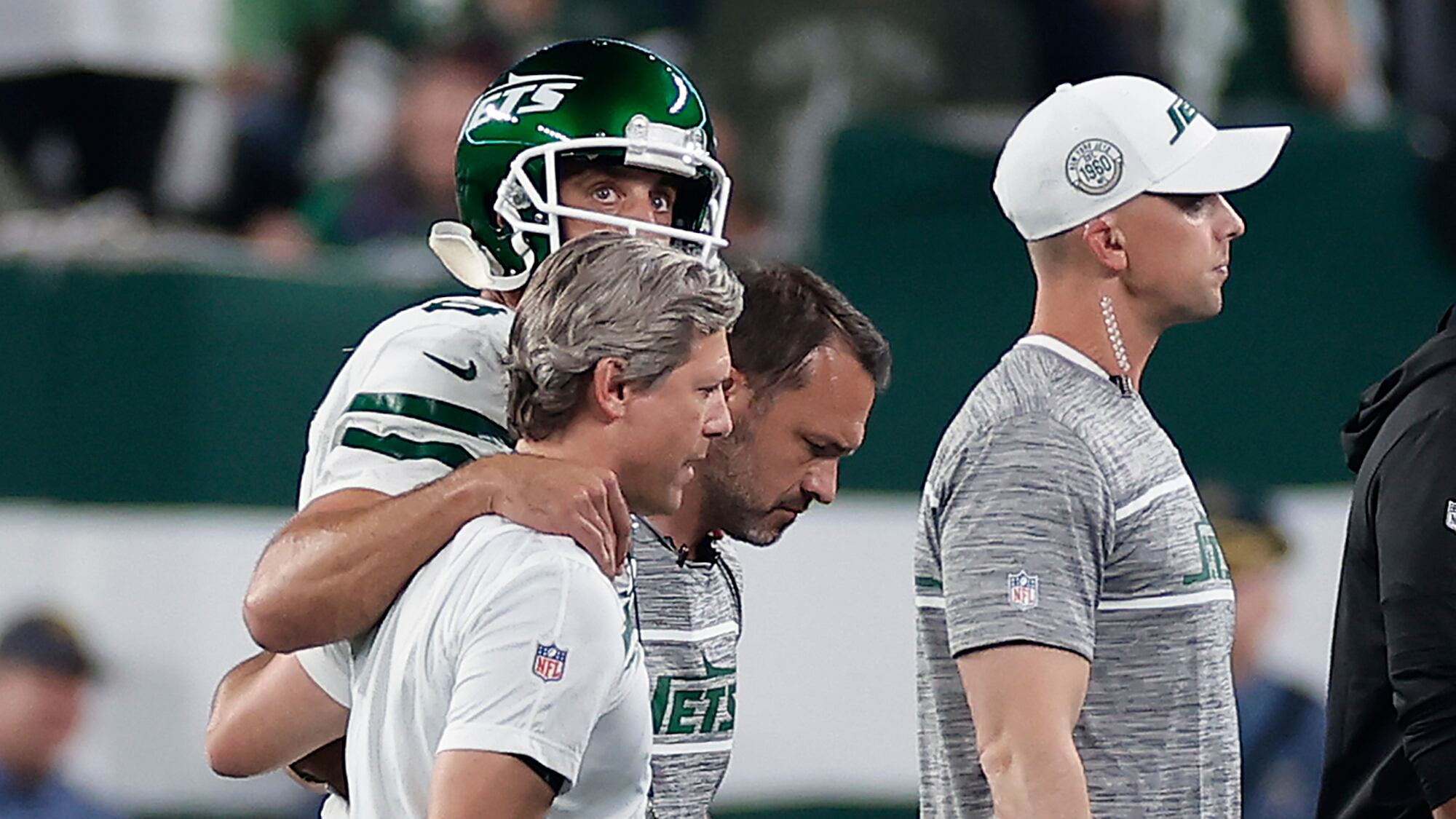 Rodgers sufrió la lesión apenas en su cuarta jugada con los Jets, su nuevo equipo. Intentó esquivar el asedio de Leonard Floyd. El jugador de los Bills de Buffalo logró alcanzar al quarterback, quien cayó al césped artificial del estadio MetLife. Rodgers se reincorporó por unos instantes, miró hacia la banca de los Jets y volvió a sentarse, evidenciando que había sufrido una lesión grave.