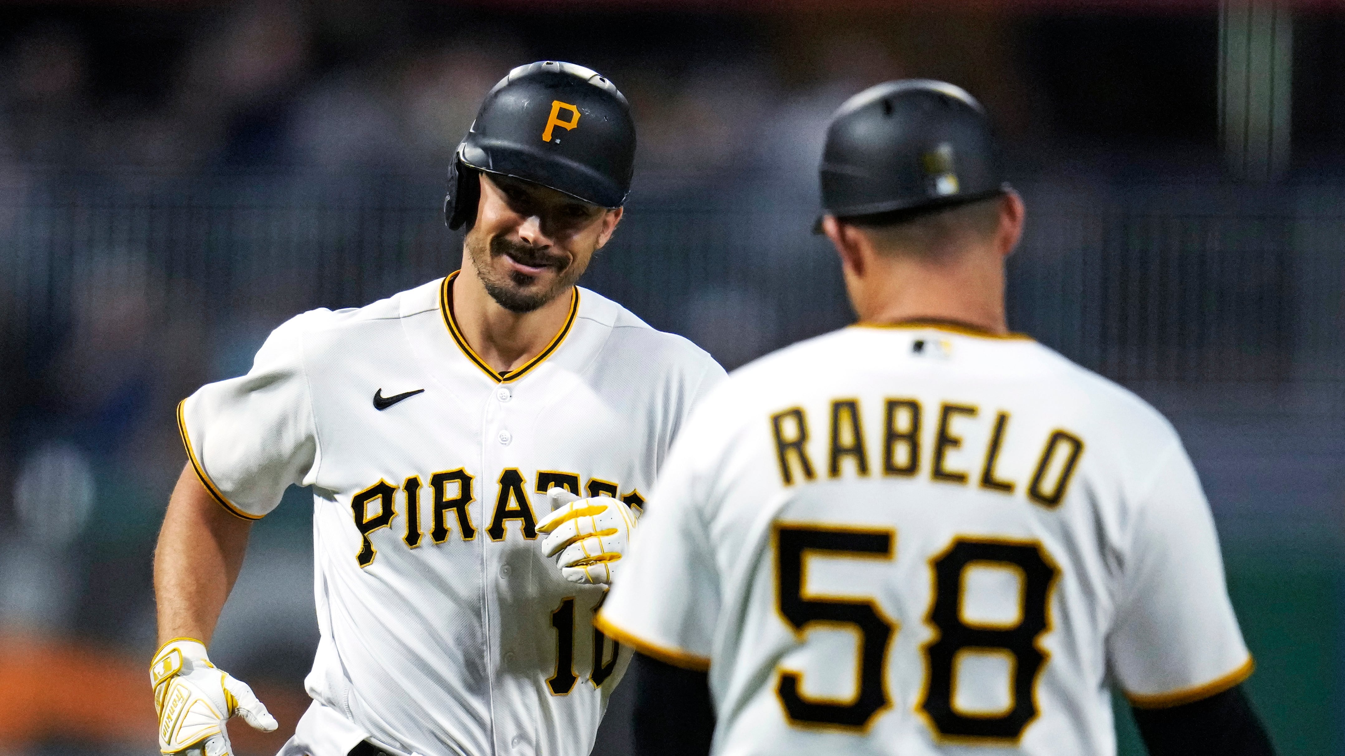 Bryan Reynolds, izquierda, de los Piratas de Pittsburgh, rodea por tercera base mientras es felicitado por el coach de tercera base Mike Rabelo después de batear un cuadrangular de dos carreras ante el abridor de los Nacionales de Washington, Jackson Rut AP (Gene J. Puskar/AP)