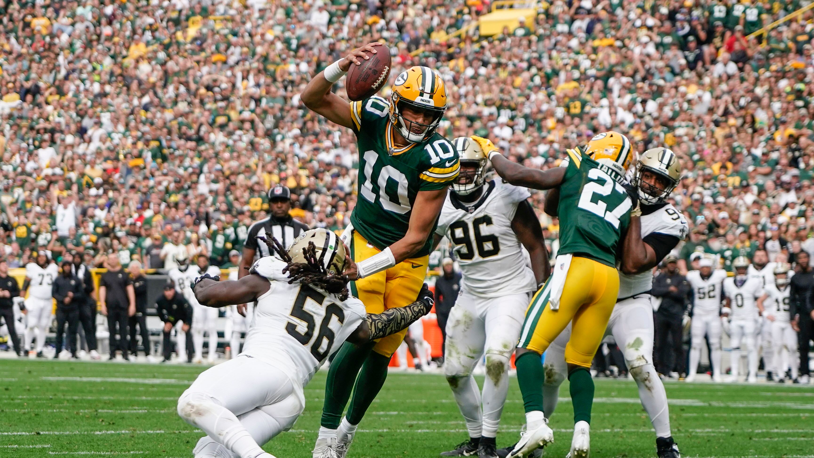 Nueva Orleáns tenía ventaja de 17-0 cuando Carr salió con una lesión en el hombro en el tercer cuarto después de ser capturado por Rashan Gary, quien terminó con tres sacks el partido, su mejor registro. Ello preparó el terreno para que Love lograra el tipo de remontada que su predecesor Aaron Rodgers orquestó en este campo muchas veces.