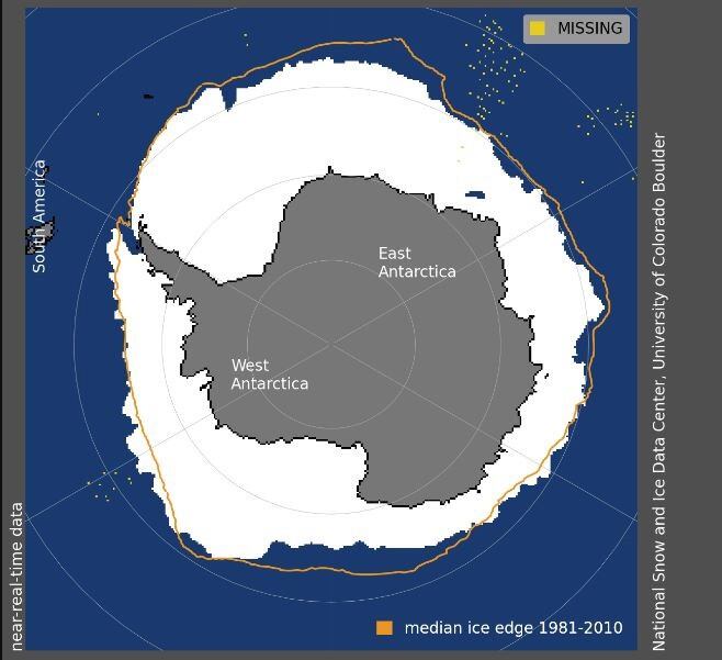 El pico de hielo marino en la Antártida de este año está 1,03 millones de kilómetros cuadrados por debajo del mínimo histórico anterior establecido en 1986. También está 1,75 millones de kilómetros cuadrados por debajo de la extensión máxima promedio de la Antártida entre 1981 y 2010. Esta es la primera vez que la extensión del hielo marino no ha superado los 17 millones de kilómetros cuadrados.