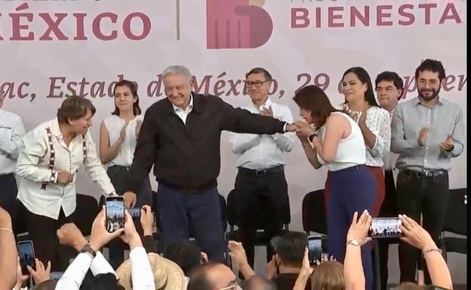 El presidente López Obrador levantó la mano a mandataria estatal y fue cuando la alcaldesa de Tecámac, Mariela Gutiérrez le besó la mano a AMLO.