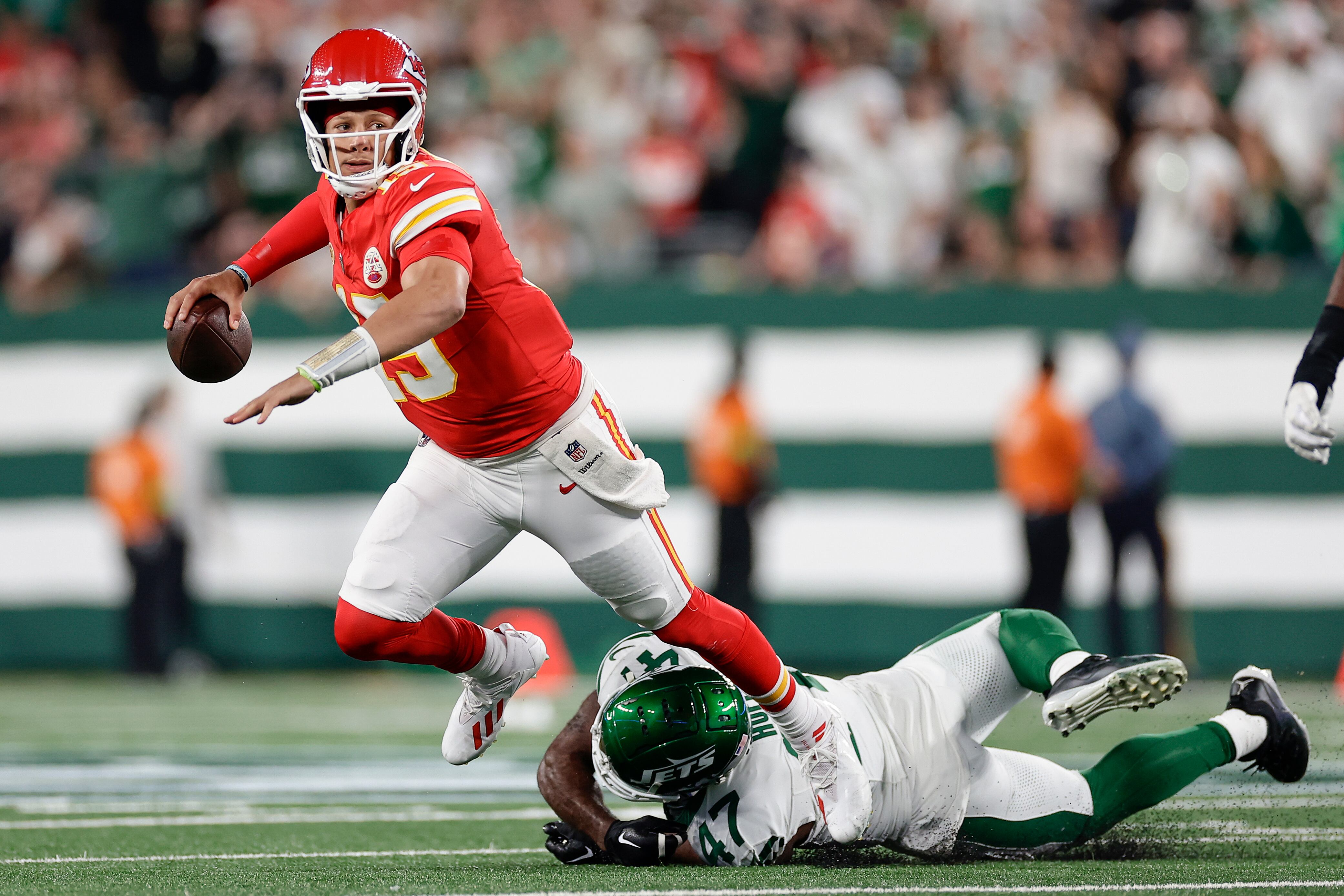 Mahomes, quien logró un acarreo de 24 yardas en tercera y 22 por avanzar para extender una serie ofensiva, corrió 11 yardas para otra tercera oportunidad, dejando el balón en la yarda dos de los Jets, sellando la victoria.