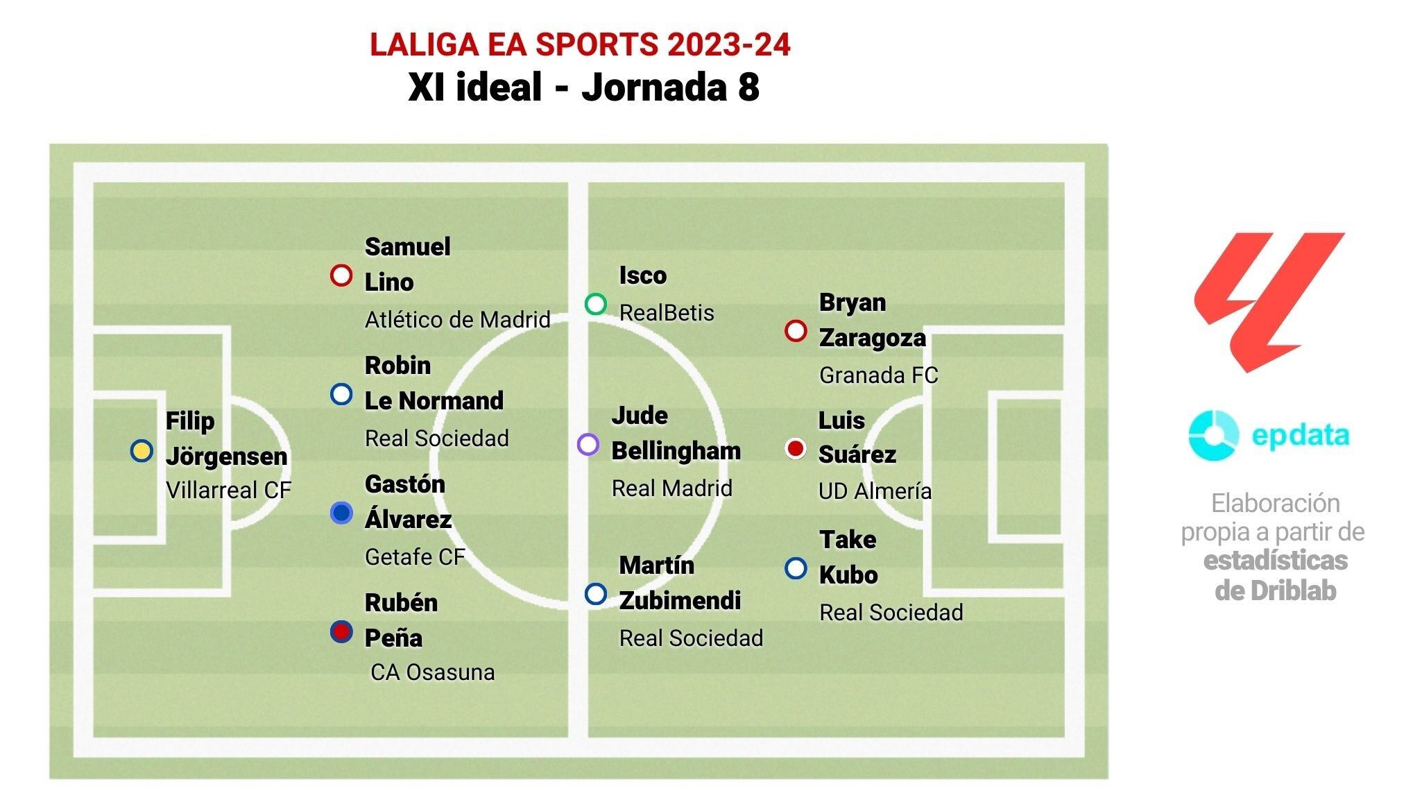 El once completo está compuesto por: Filip Jörgensen (Villarreal CF); Samuel Lino (Atlético de Madrid), Robin Le Normand (Real Sociedad), Gastón Álvarez (Getafe CF), Rubén Peña (CA Osasuna); Isco (Real Betis), Jude Bellingham (Real Madrid), Martín Zubimendi (Real Sociedad); Bryan Zaragoza (Granada CF), Luis Suárez (UD Almería) y Take Kubo (Real Sociedad).