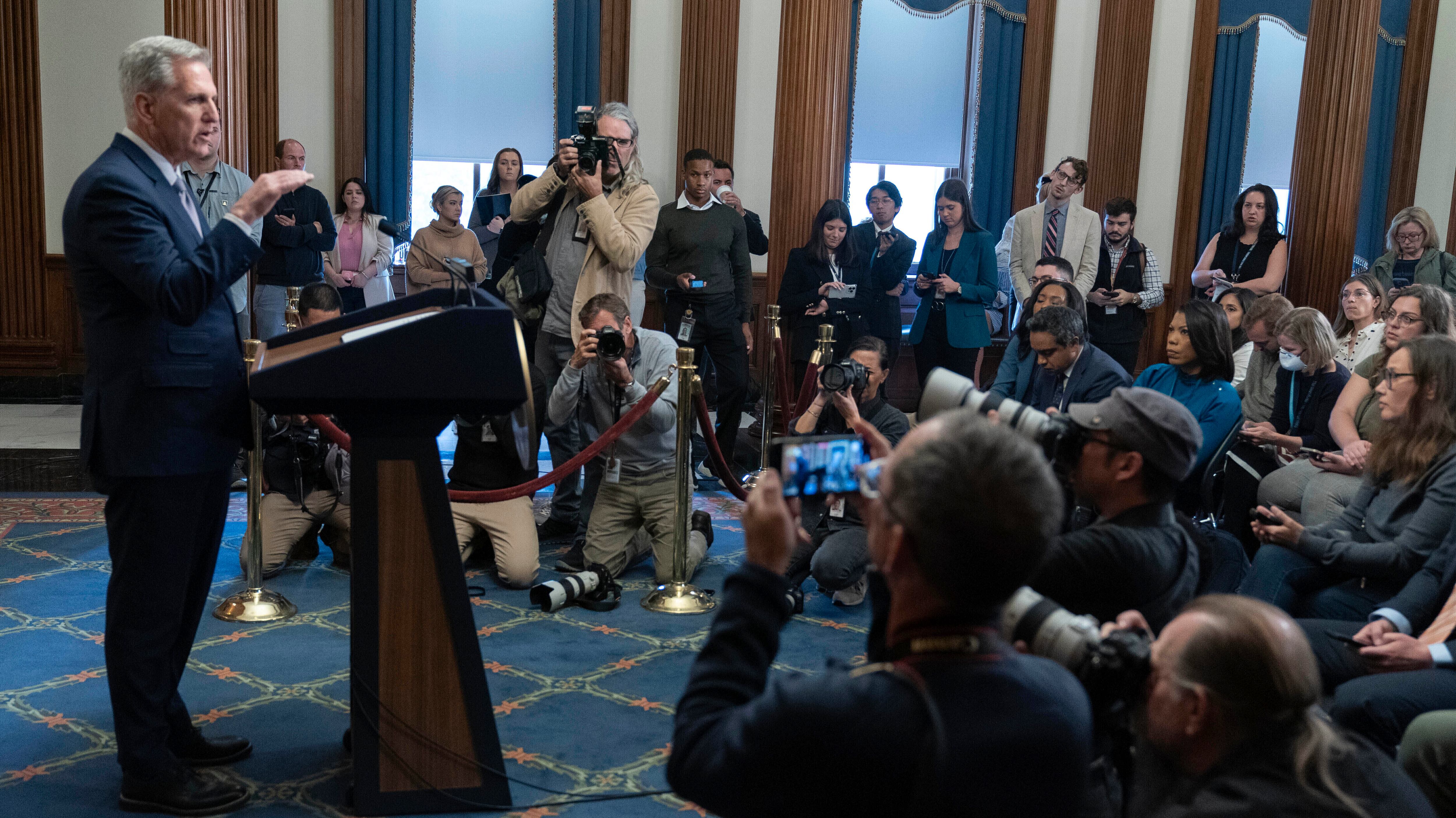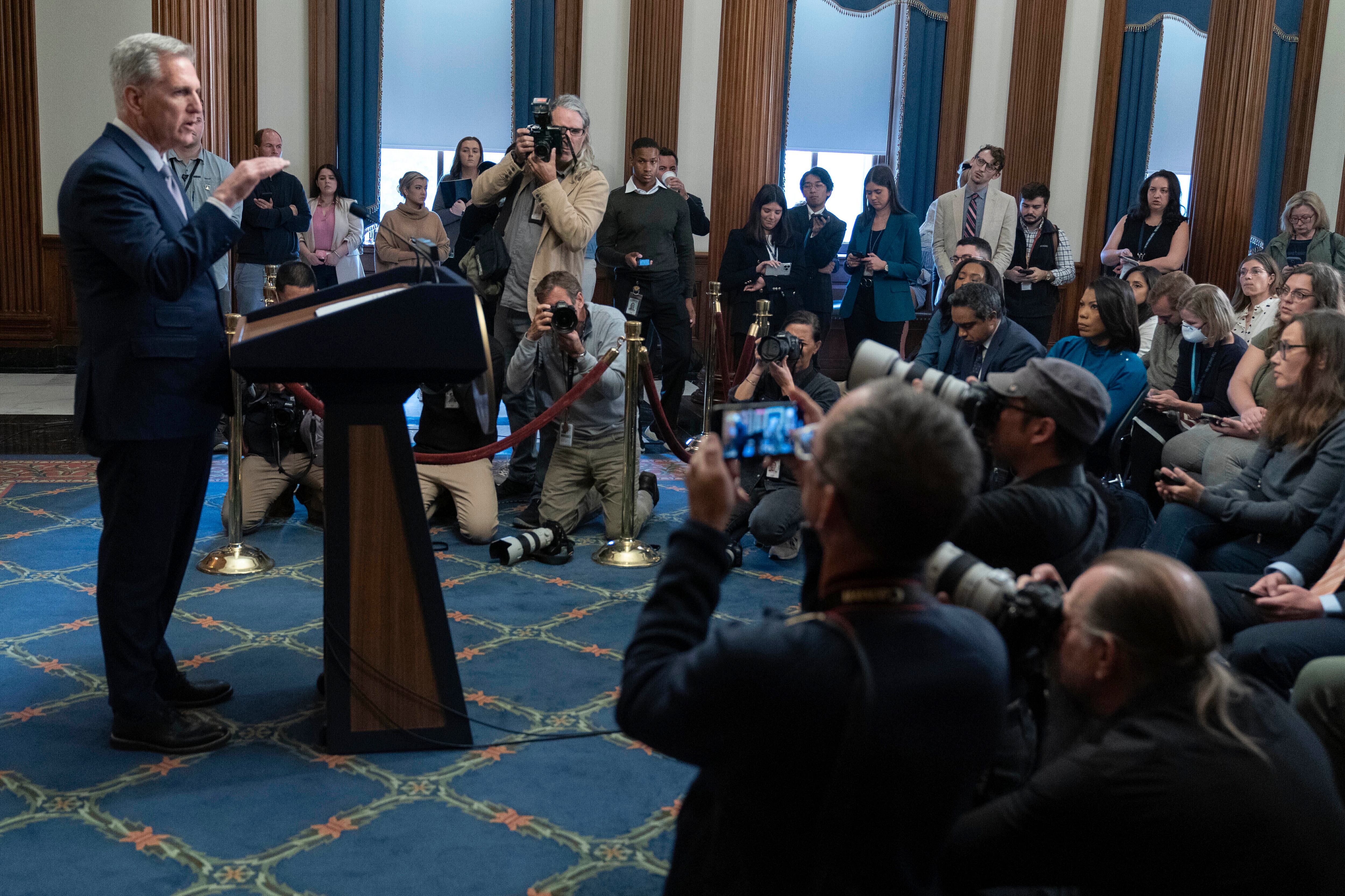El lunes, el expresidente destituido, Kevin McCarthy, rápidamente intentó ocupar ese vacío, al criticar duramente al gobierno del presidente Joe Biden con relación a la firmeza de su defensa de Israel y posicionándose como el líder republicano de facto a pesar de que sus colegas lo echaron del puesto.