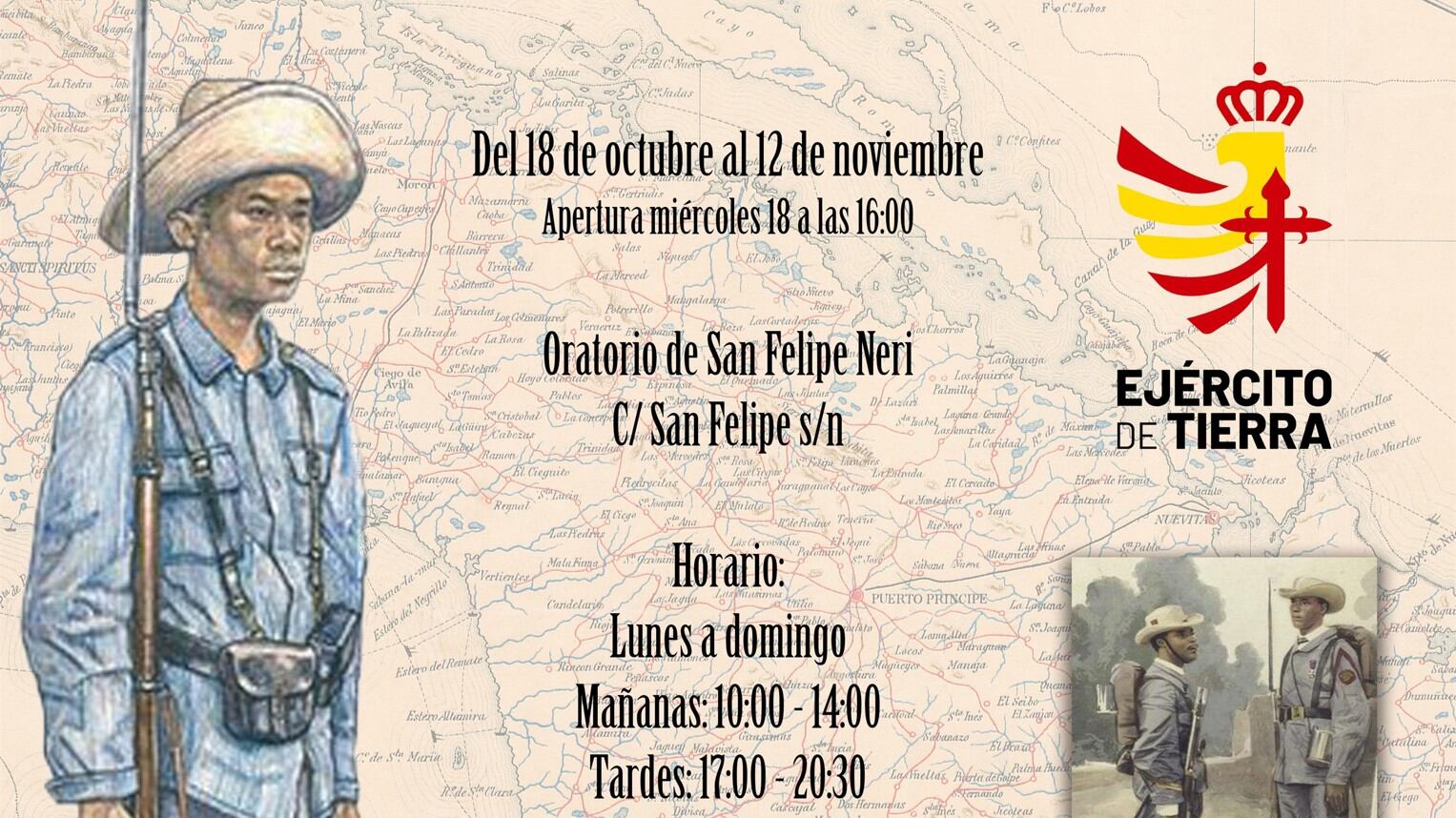 Así, se ha organizado una exposición en el Oratorio de San Felipe que tratará los aspectos de antecedentes y contexto histórico, mostrando cómo era aquel ejército en las campañas de ultramar, sus mandos, sus equipos y pertrechos o elementos de la vida cotidiana, así como los hechos de armas más representativos en Cuba, Puerto Rico (Antillas) y las Islas Filipinas.
