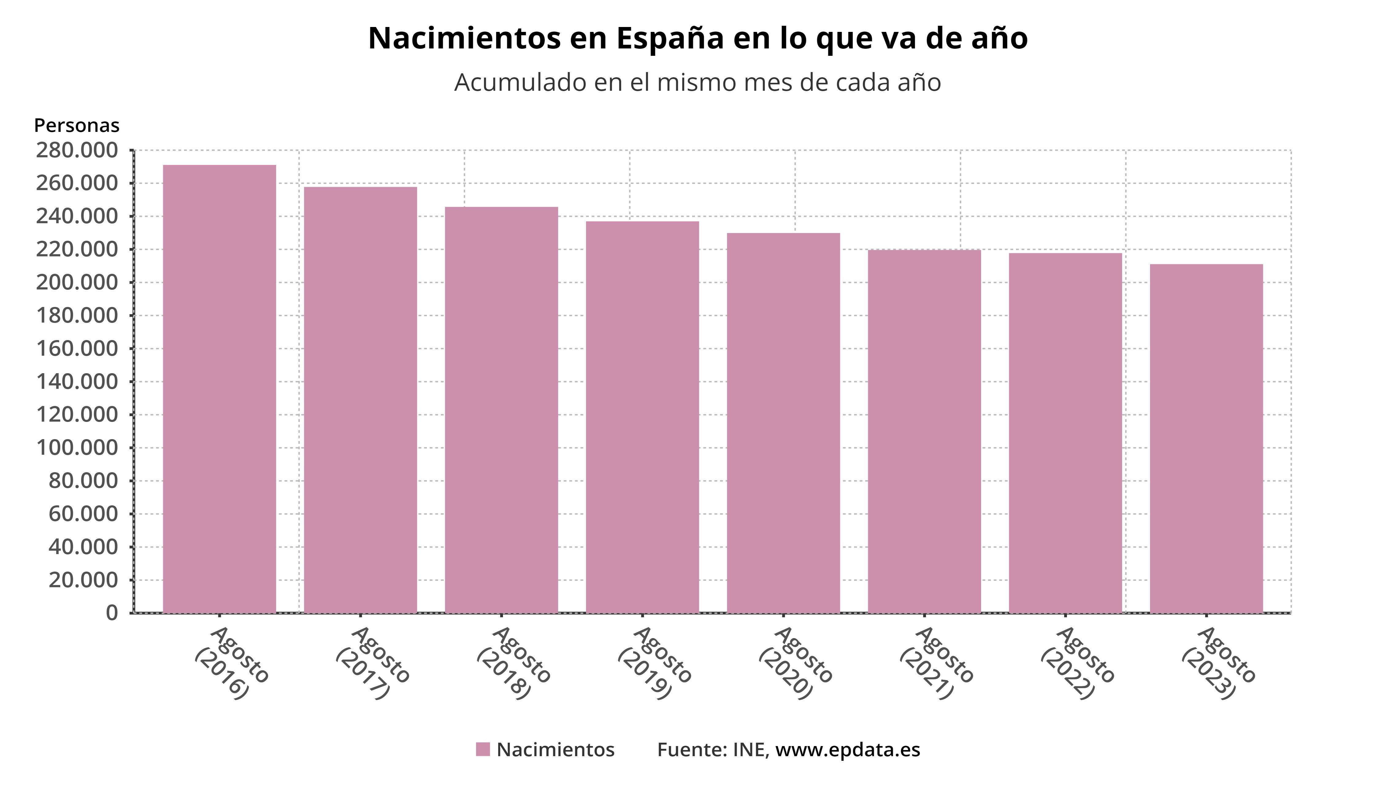Según los datos del INE, recogidos por Europa Press, durante los ocho primeros meses de 2023 se estima que han nacido en España 211.077 niños; frente a los 217.939 en 2022; 219.635 en 2021; 229.904 en 2020; 236.965 en 2019; 245.696 en 2018; y 257.779 en 2017. Continúa así la tendencia a la baja desde que se contabilizan estos datos mensuales.