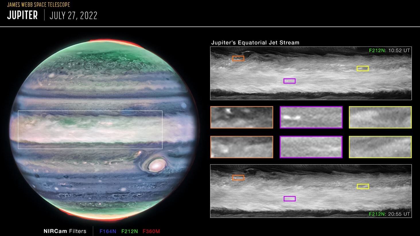 El equipo de investigación analizó datos de la NIRCam (cámara de infrarrojo cercano) de Webb capturados en julio de 2022. El programa Early Release Science, dirigido conjuntamente por Imke de Pater de la Universidad de California, Berkeley y Thierry Fouchet del Observatorio de París, fue diseñado para tome imágenes de Júpiter con 10 horas de diferencia, o un día de Júpiter, en cuatro filtros diferentes, cada uno de ellos capaz de detectar cambios en pequeñas características a diferentes altitudes de la atmósfera de Júpiter.