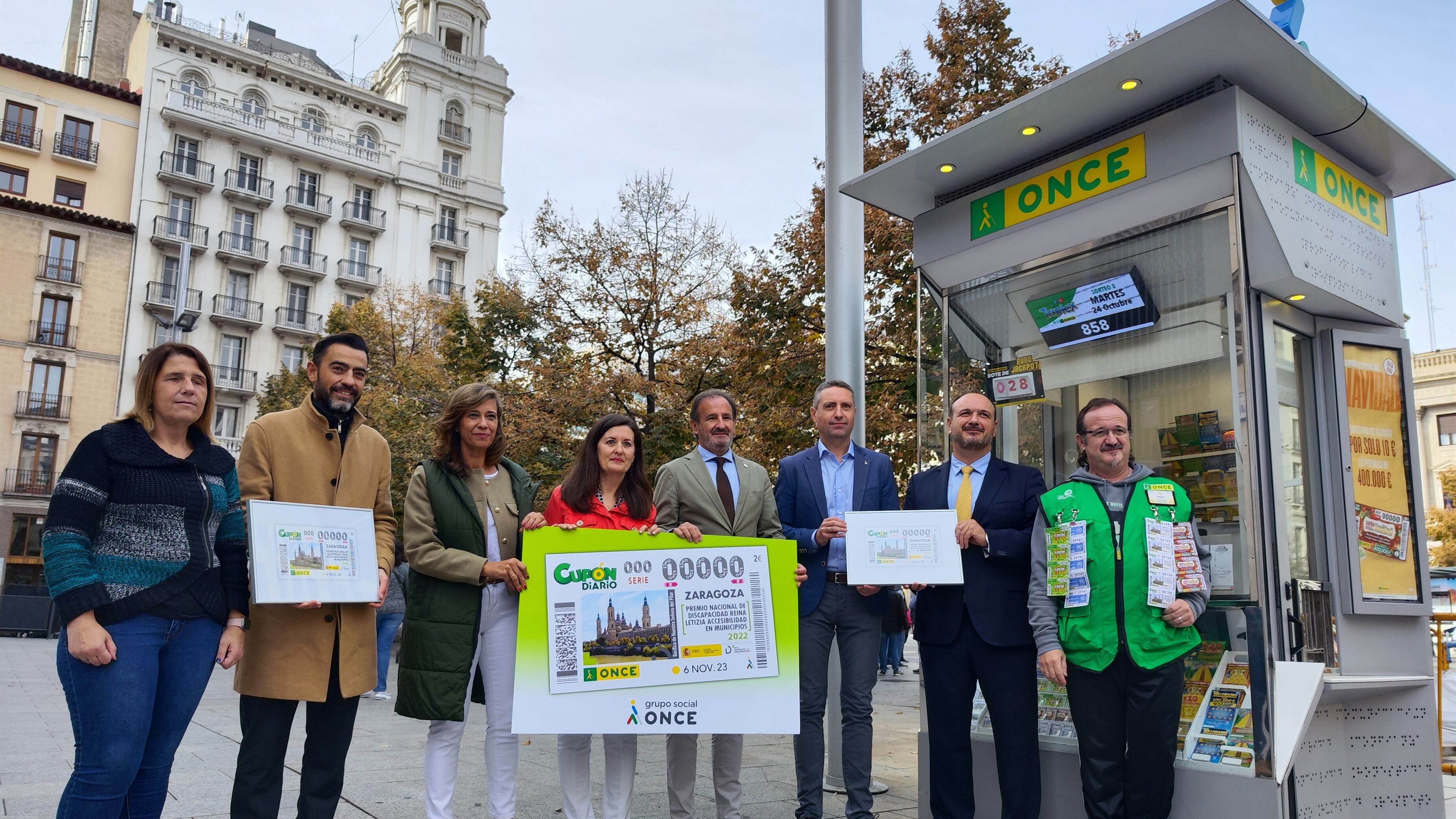 Así lo han presentado a los medios de comunicación el consejero municipal de Presidencia, Relaciones Institucionales y Seguridad Ciudadana del Ayuntamiento, Ángel Lorén, y la delegada de la ONCE en Aragón, Raquel Pérez, en el quiosco de la ONCE de plaza España.
