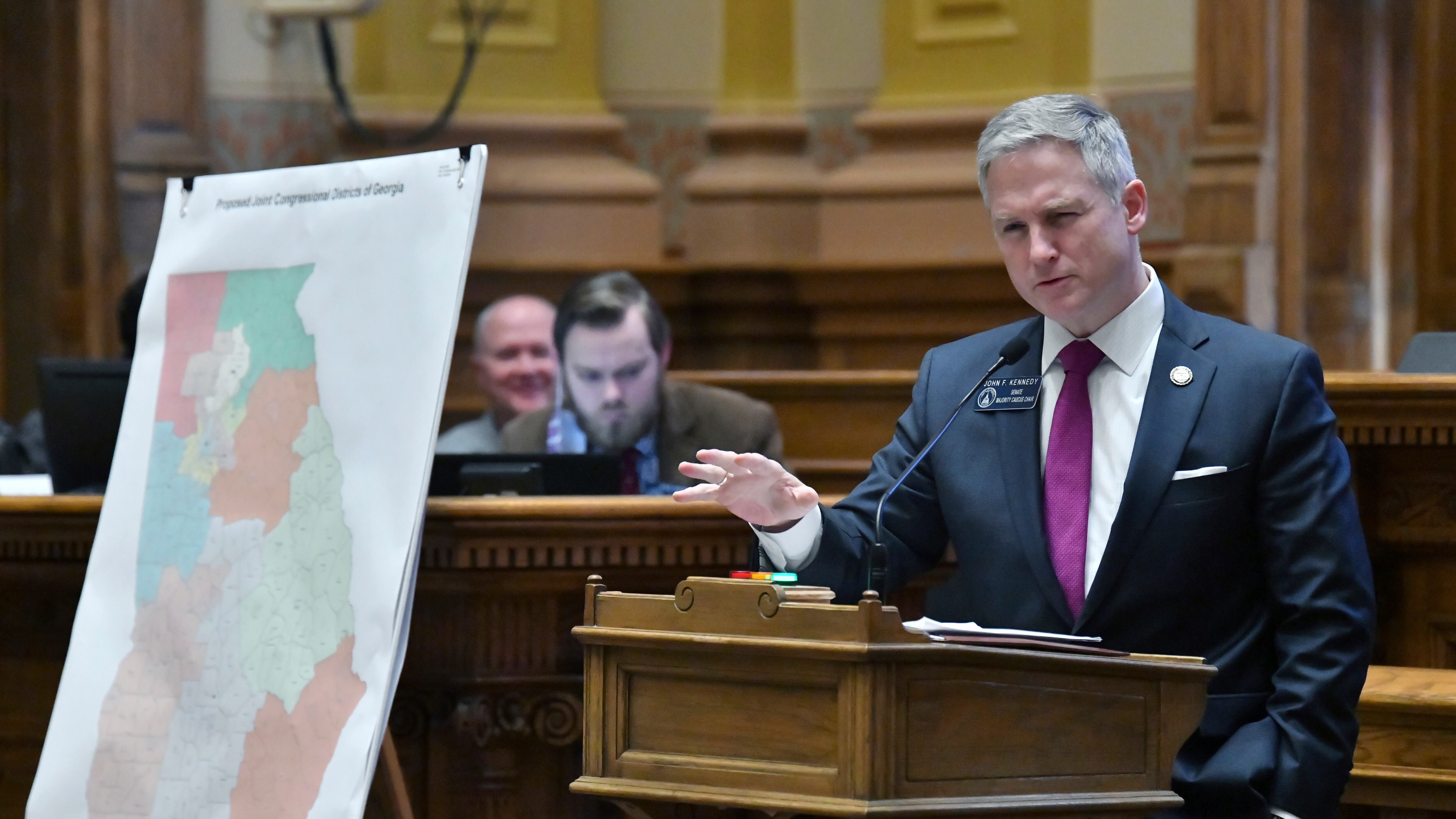 ARCHIVO - El senador estatal demócrata John Kennedy presenta los nuevos mapas legislativos de Georgia en una sesión especial del Senado en Atlanta, 19 de noviembre de 2021. Un juez federal sentenció el jueves 26 de octubre de 2023 que los nuevos distri AP (Hyosub Shin/AP)