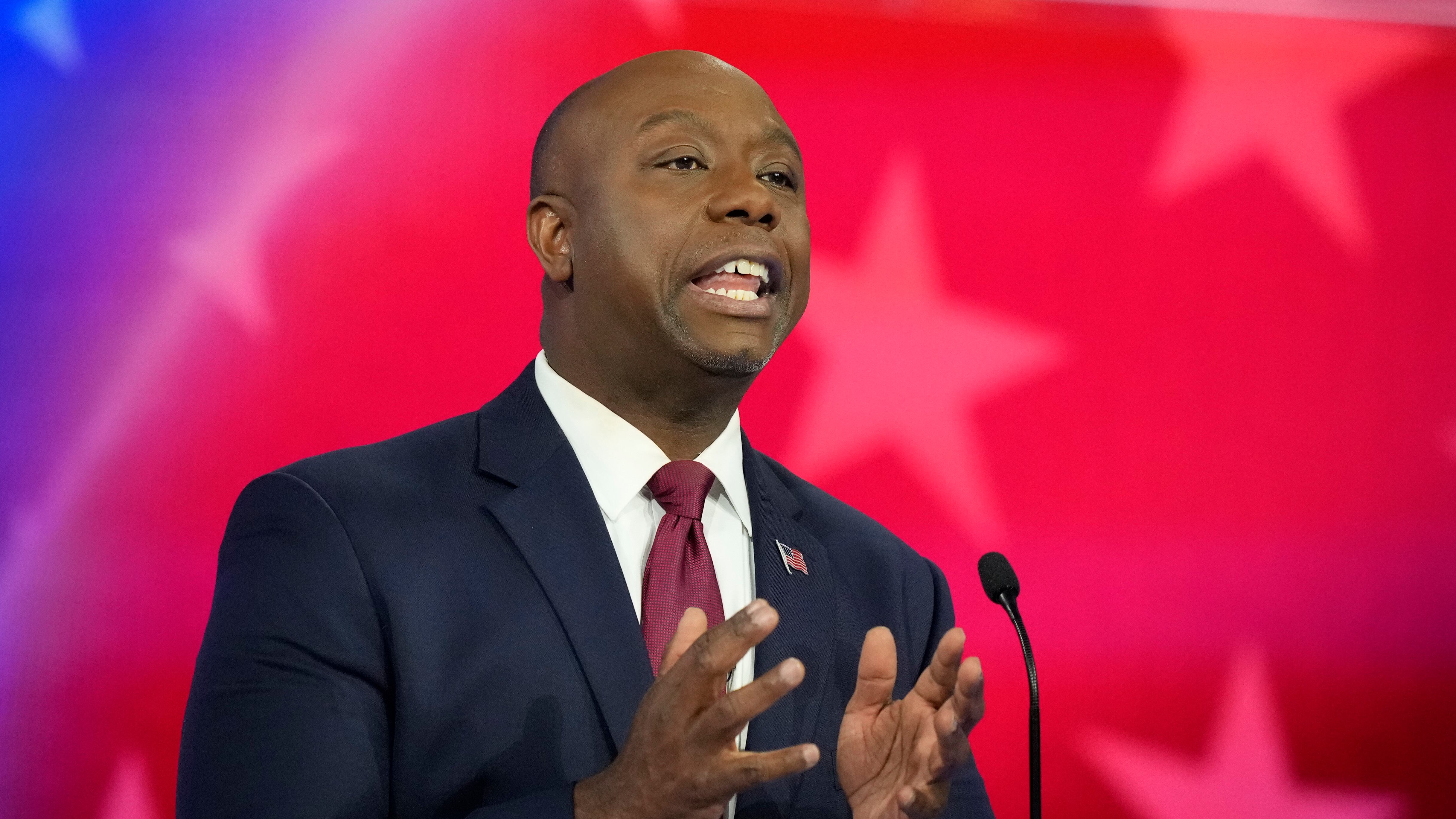 Tim Scott, senador por Carolina del Sur, habla durante un debate entre aspirantes a la candidatura presidencial republicana el miércoles 8 de noviembre de 2023, en el Centro Adrienne Arsht para las Artes Escénicas del condado Miami-Dade, en Miami. (AP F AP (Rebecca Blackwell/AP)
