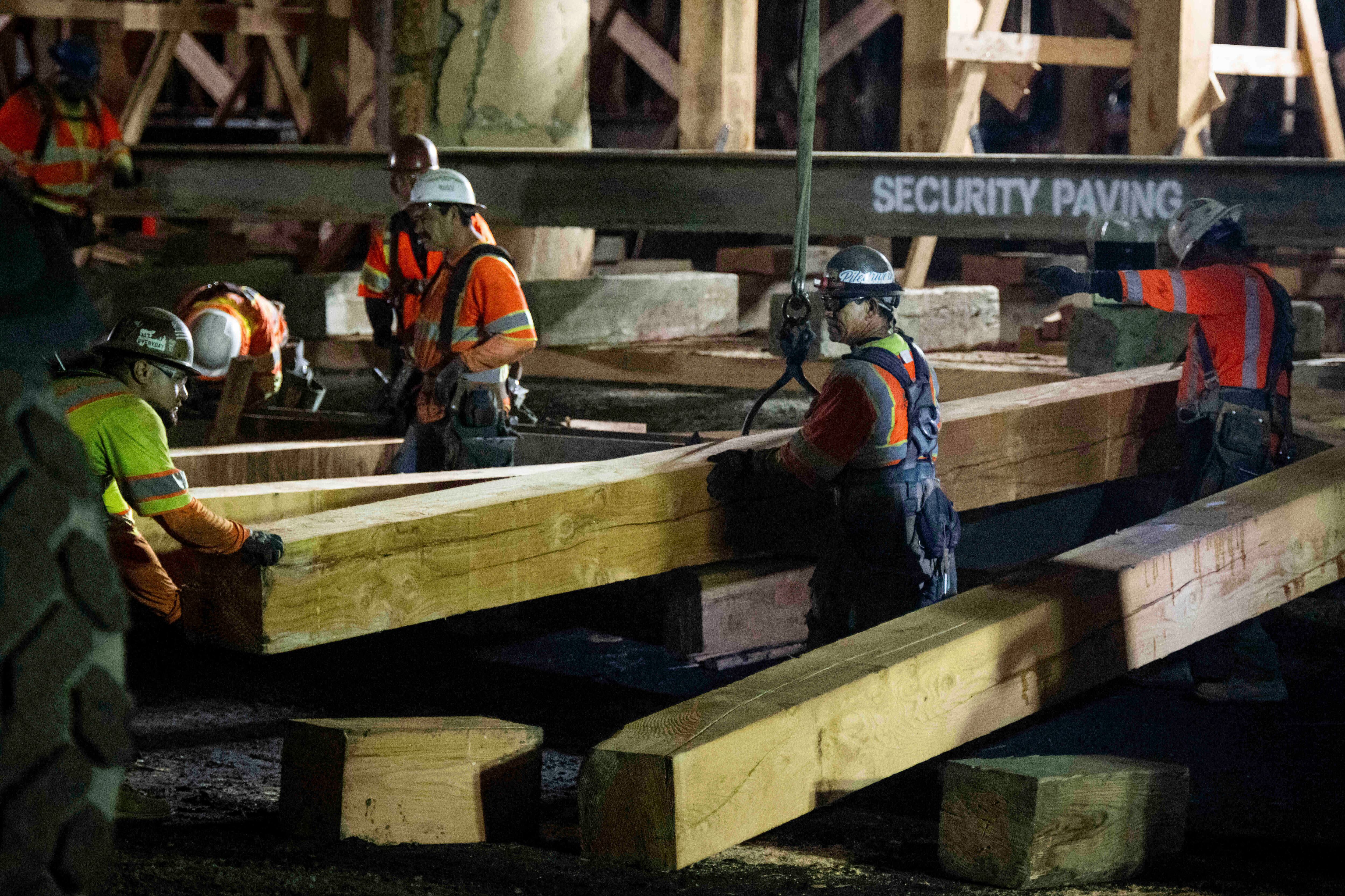 Equipos de construcción apuntalan la autopista 10 dañada por el fuego el jueves 16 de noviembre de 2023, en Los Ángeles. (Sarah Reingewirtz/The Orange County Register via AP) AP (Sarah Reingewirtz/AP)