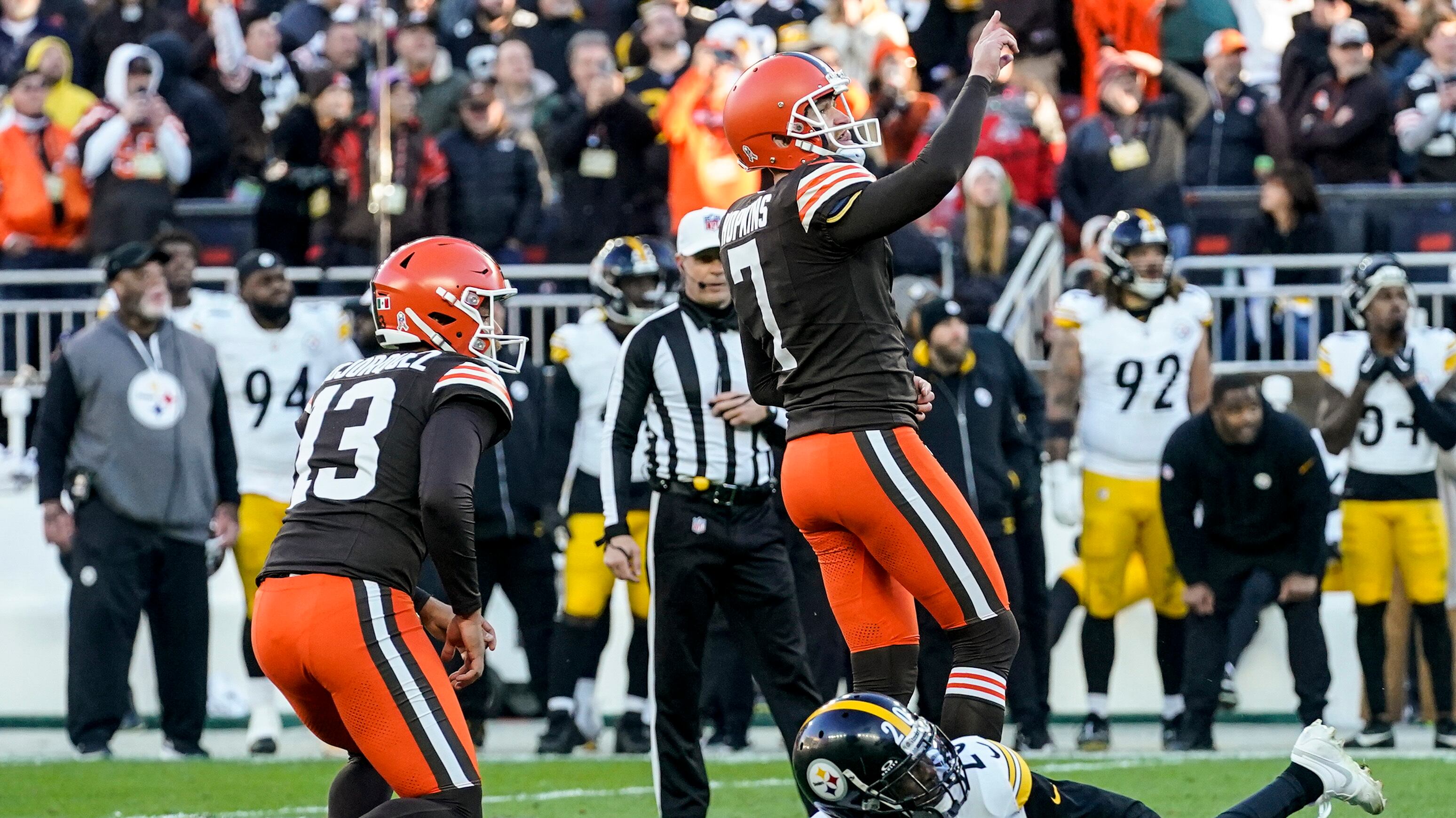 CLEVELAND (AP) — Dustin Hopkins concretó un gol de campo de 34 yardas con dos segundos por jugar luego que el quarterback novatoDorian Thompson-Robinson completara cuatro pases claves, dándole el triunfo de 13-10 a los Browns sobre sus rivales los Steelers de Pittsburgh el domingo.