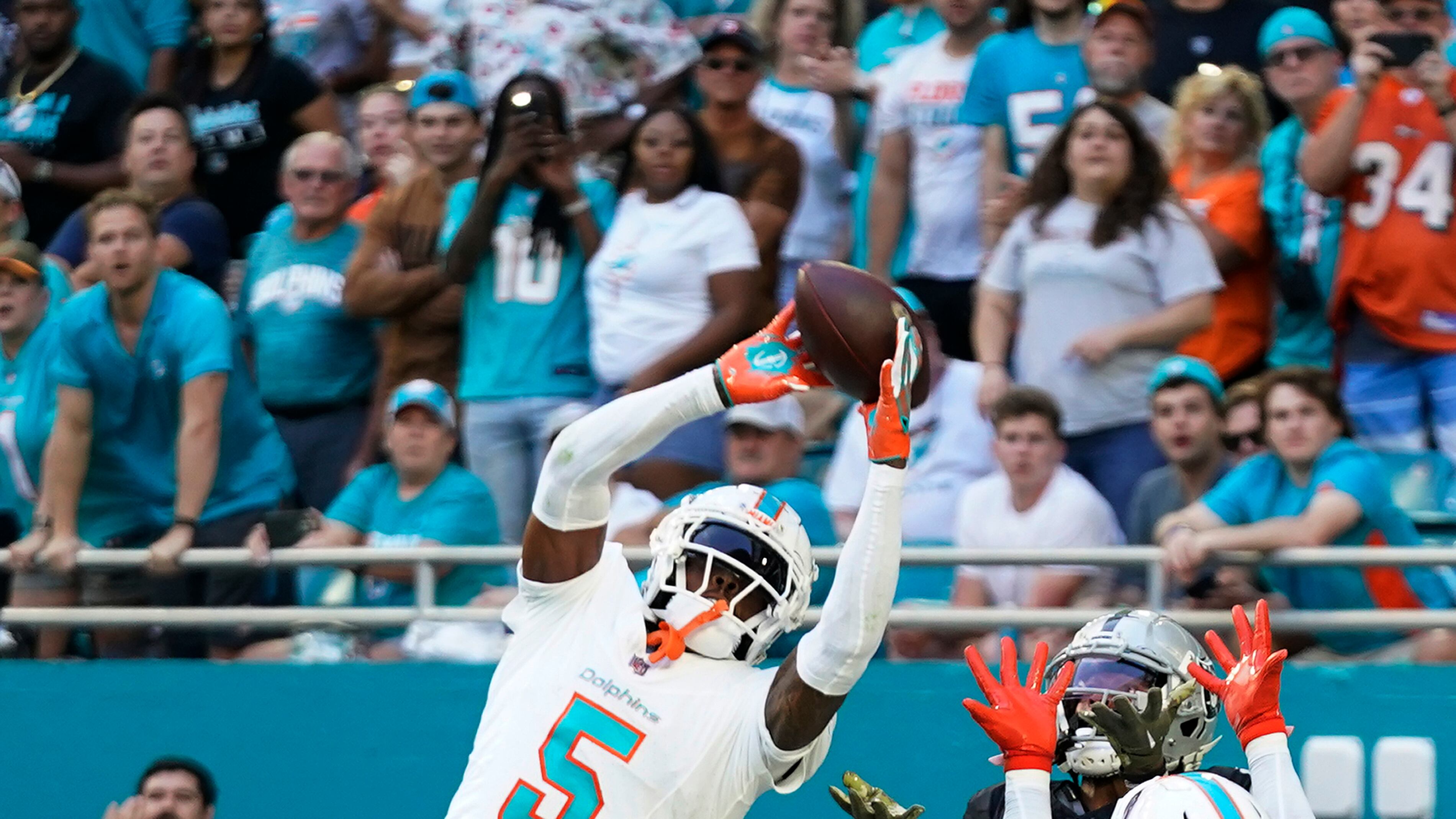 Jalen Ramsey (5), cornerback de los Dolphins de Miami, intercepta un pase en la zona de anotación que buscaba las manos de Tre Tucker (11), wide receiver de los Raiders de Las Vegas durante la segunda mitad del juego de la NFL, el domingo 19 de noviembre AP (Wilfredo Lee/AP)