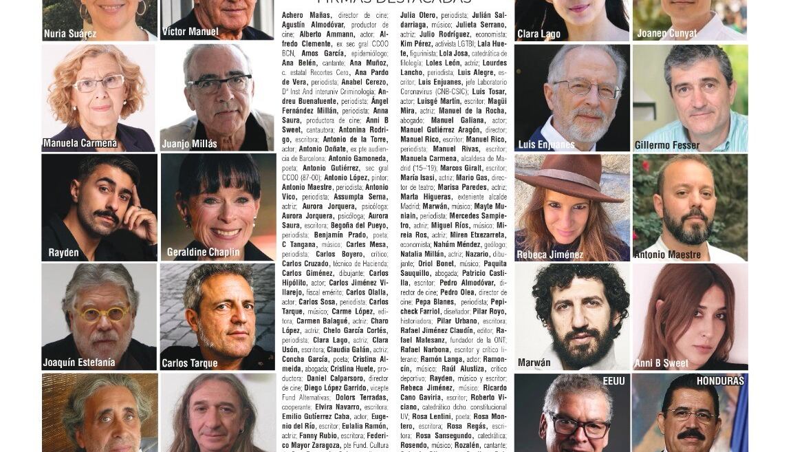 También firman los actores Luis Tosar, Geraldine Chaplin, Loles León, Alberto Ammann, Hector Alterio, los directores Pedro Almodóvar e Isabel Coixet, directores de teatro como Mario Gas, o los economistas Julen Bollaín, Juan Francisco Martín Seco y Miren Etxezarreta, además de escritores como Clara Usón, Elvira Navarro, Luisgé Martín, Marcos Giralt, el editor Jorge Herralde o el poeta Antonio Gamoneda.