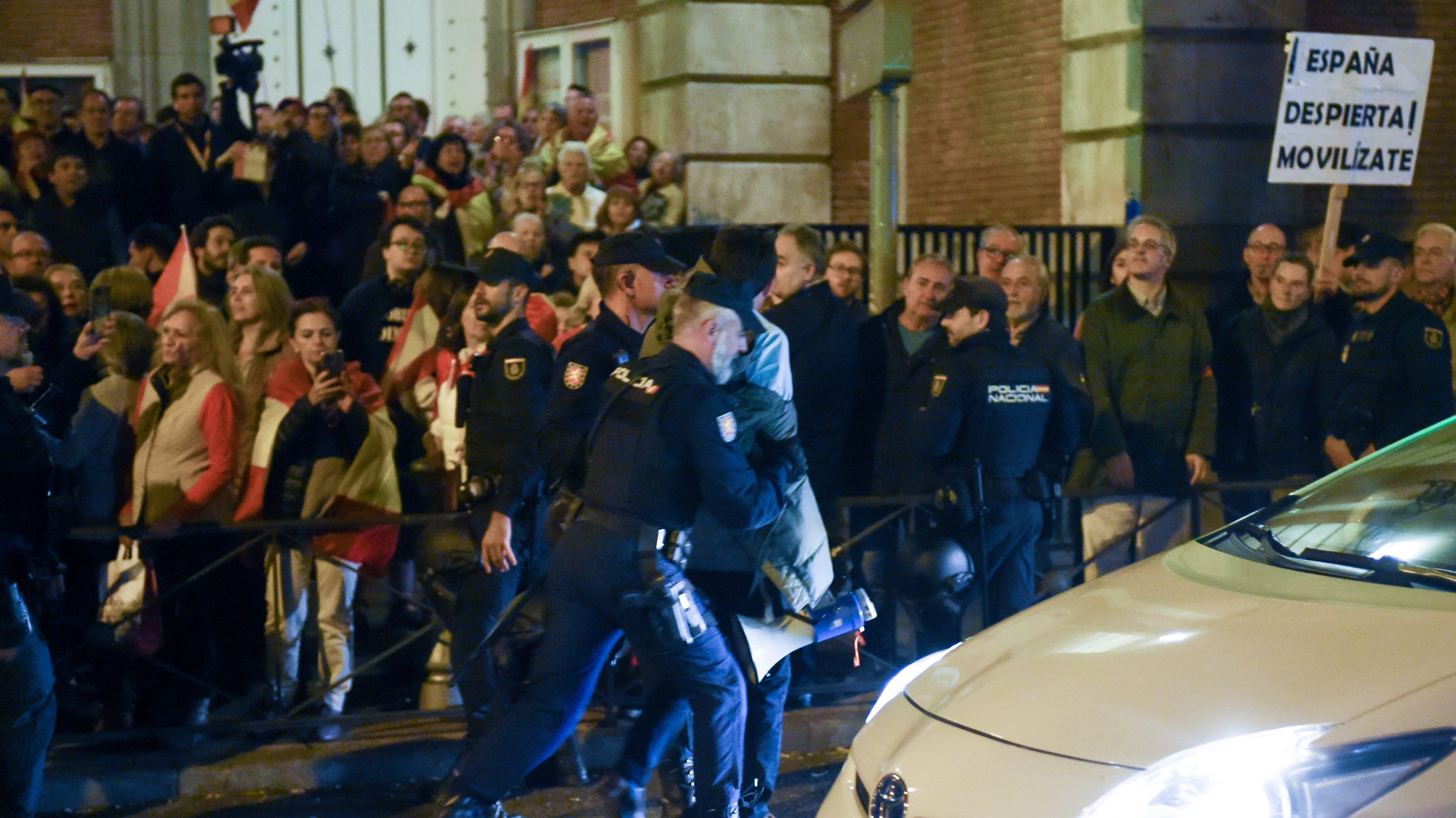 Diferentes líderes de Vox, entre ellos su presidente, Santiago Abascal, se han sumado a las protestas en Ferraz entre llamamientos para que las manifestaciones se desarrollen sin violencia.