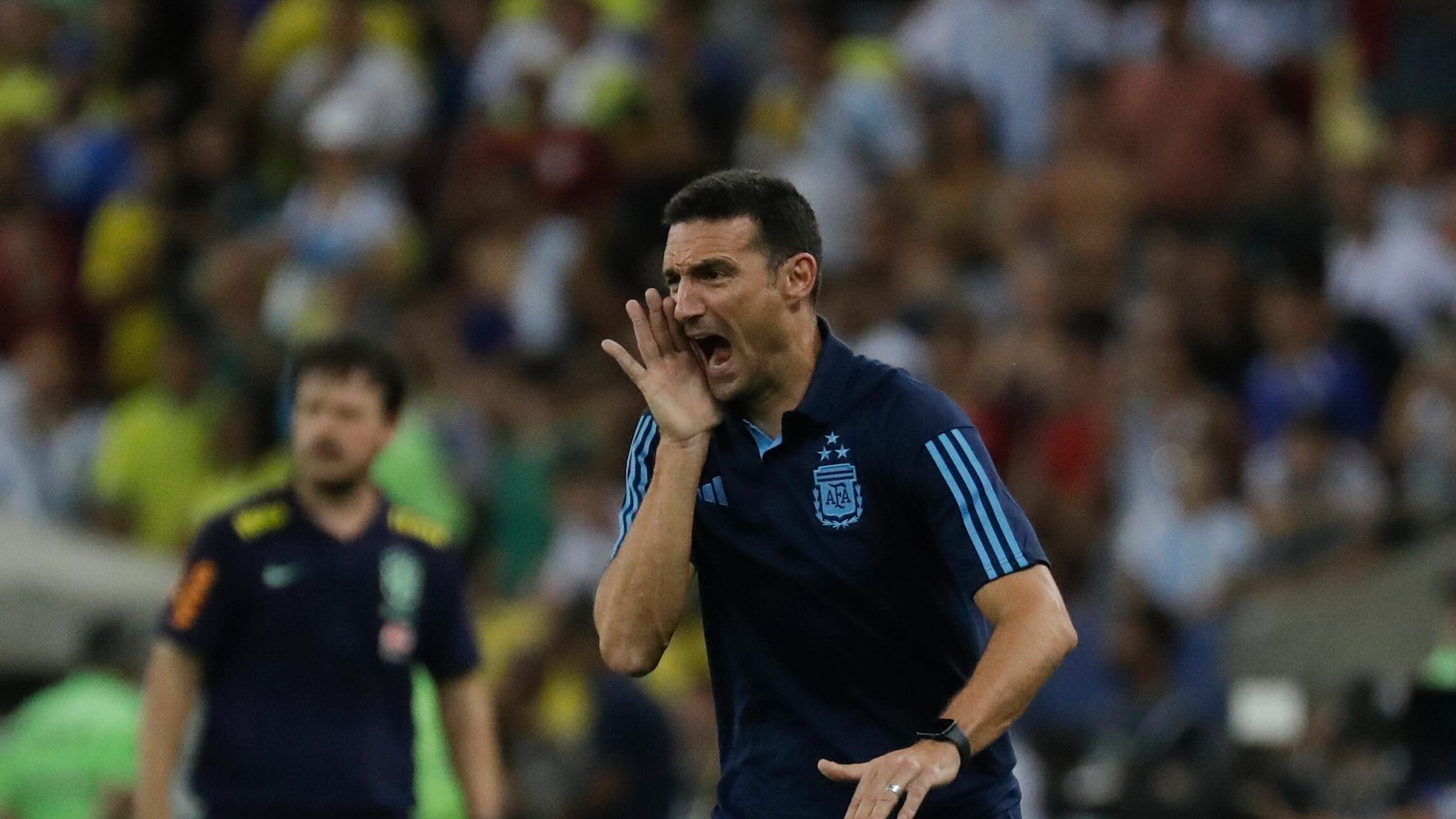 El técnico de Argentina Lionel Scaloni grita instrucciones durante el partido contra Brasil en las eliminatorias del Mundial 2026, el martes 21 de noviembre de 2026, en Río de Janeiro. (AP Foto/Bruna Prado) AP (Bruna Prado/AP)
