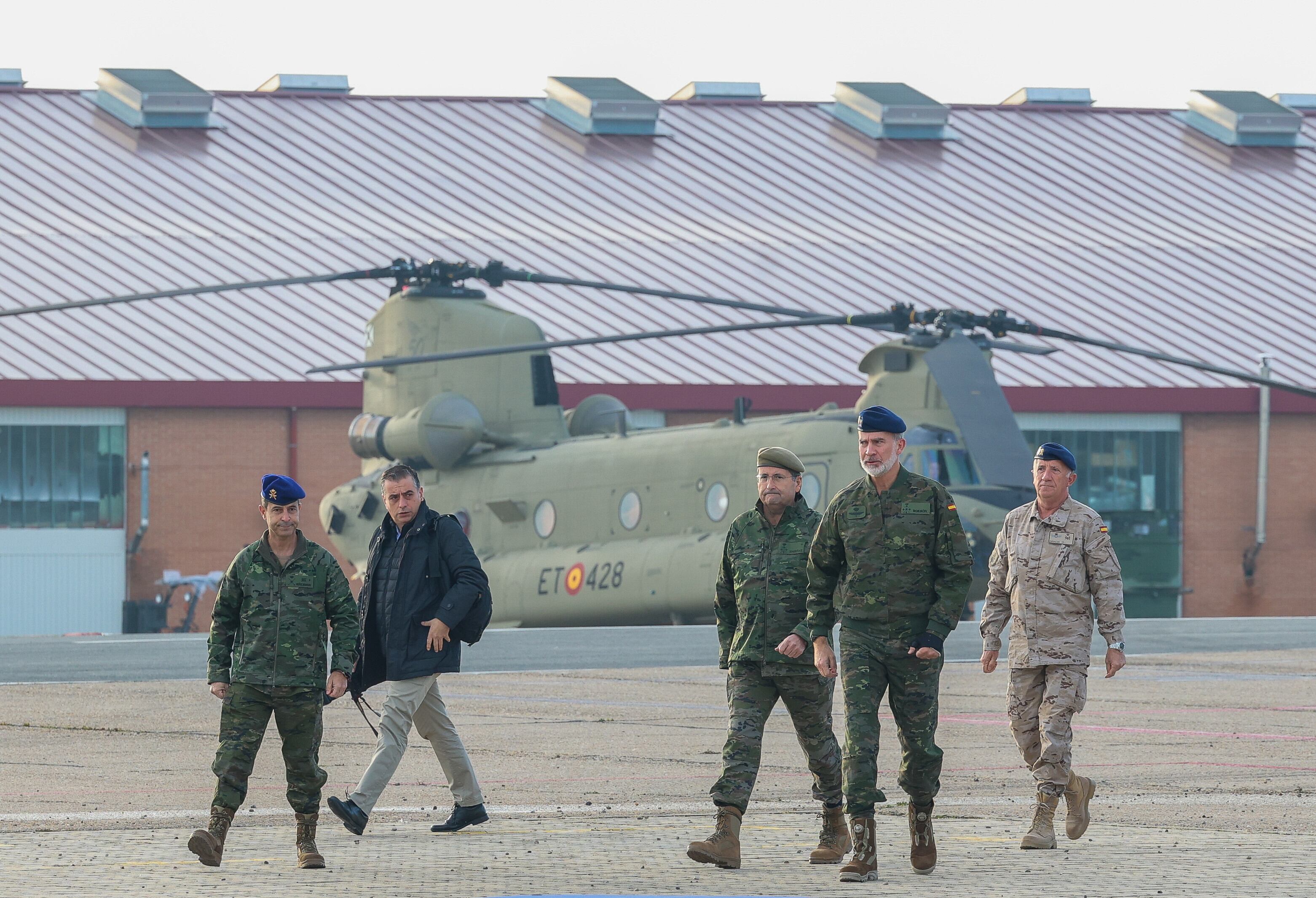 El rey Felipe VI ha visitado este lunes el Parque y Centro de Mantenimiento de Helicópteros, el Batallón de Helicópteros de Transporte número V y la Academia de Aviación del Ejército de Tierra, ubicados en la Base Coronel Maté, en Colmenar Viejo (Madrid), con motivo del 50º aniversario de su creación.