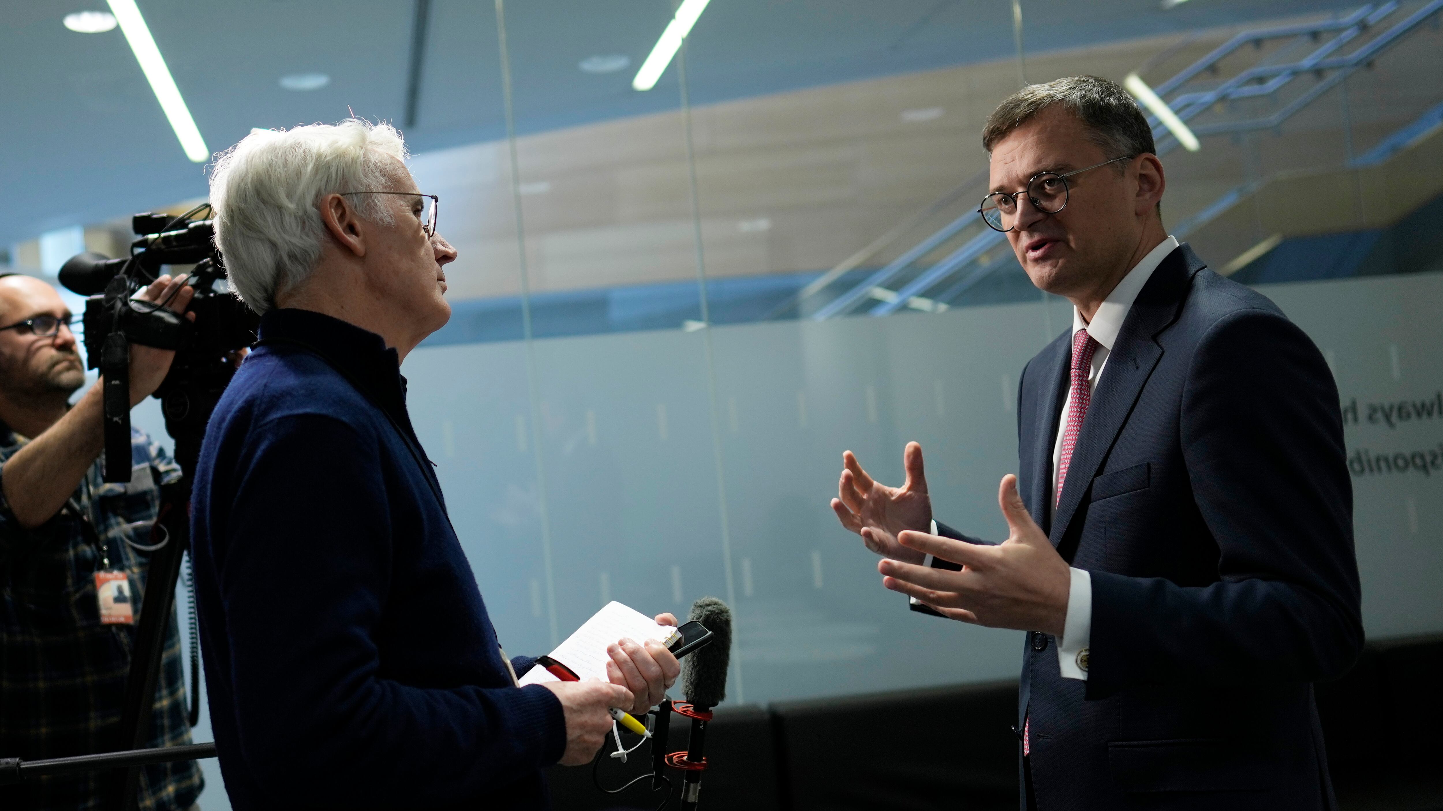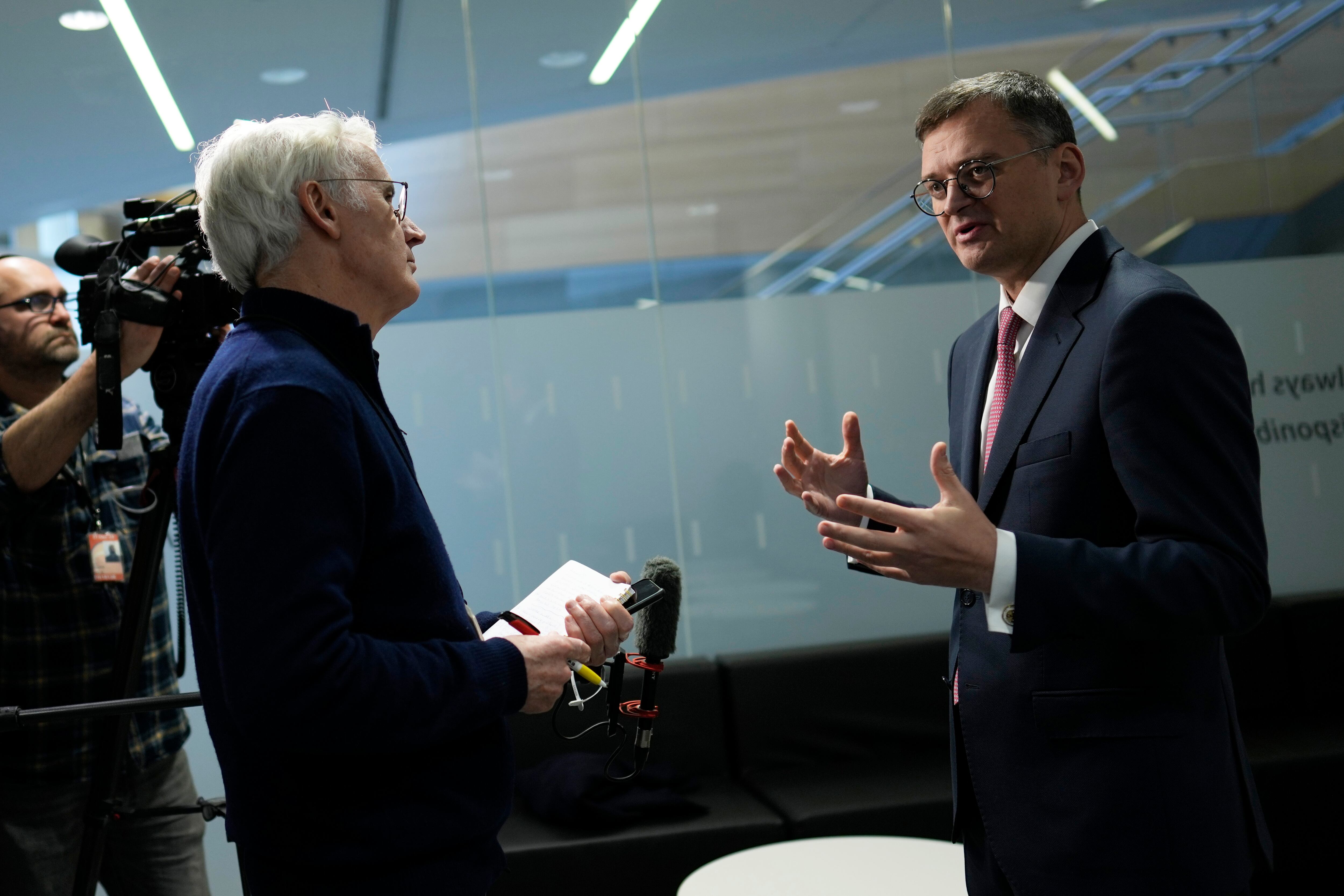 El canciller ucraniano Dmytro Kuleba (d) en una entrevista en la sede de la OTAN en Bruselas el 29 de noviembre de 2023.. (Foto AP/Virginia Mayo) AP (Virginia Mayo/AP)