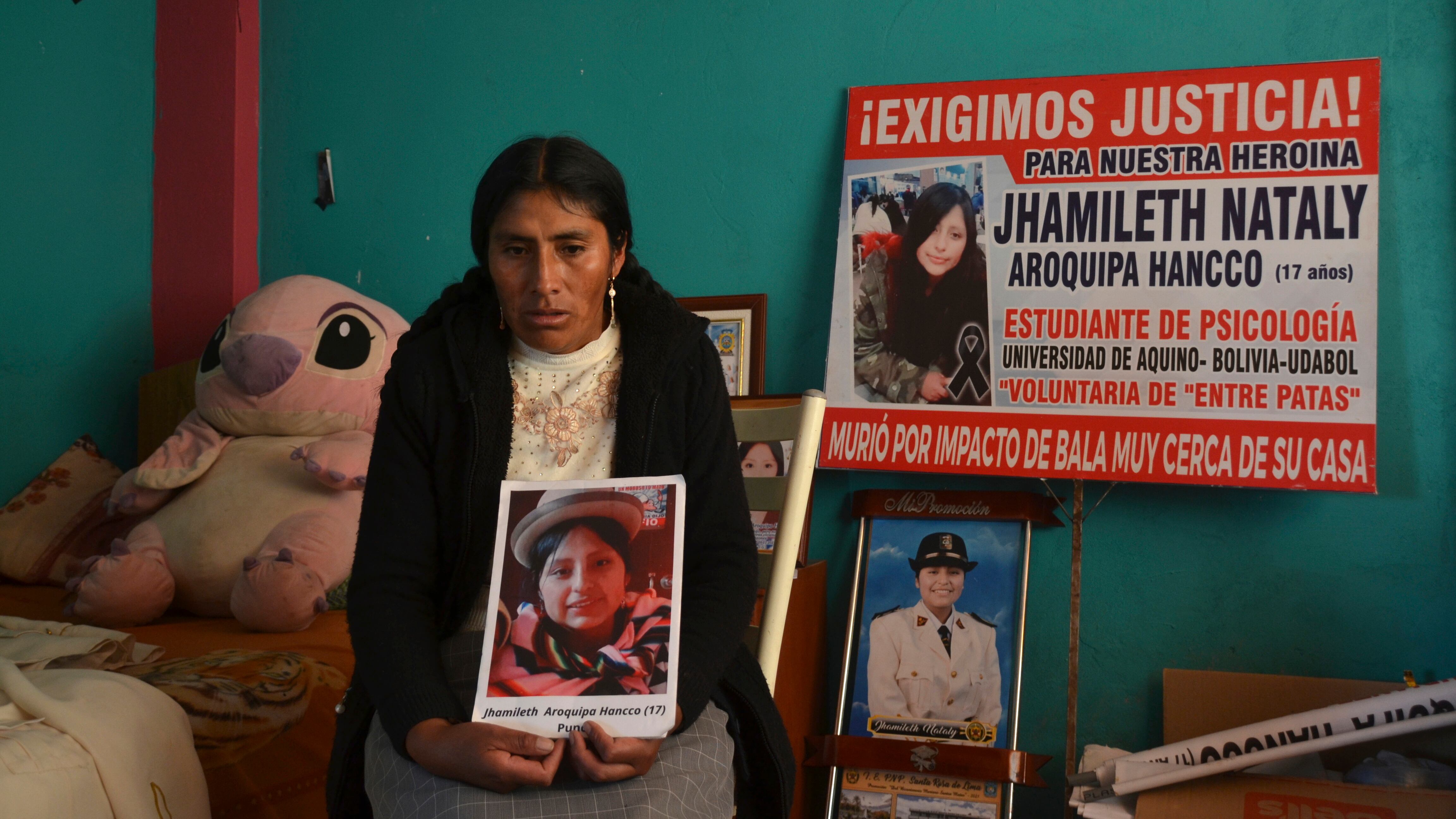 En su casa de Juliaca, Hancco continúa limpiando con frecuencia el cuarto de su hija Jhamileth donde están acumulados sus retratos, ropa, libros e incluso su peluche rosado favorito inspirado en el personaje ficticio Stitch, de la película “Lilo y Stitch” de Disney. También un letrero donde dice “exigimos justicia”.