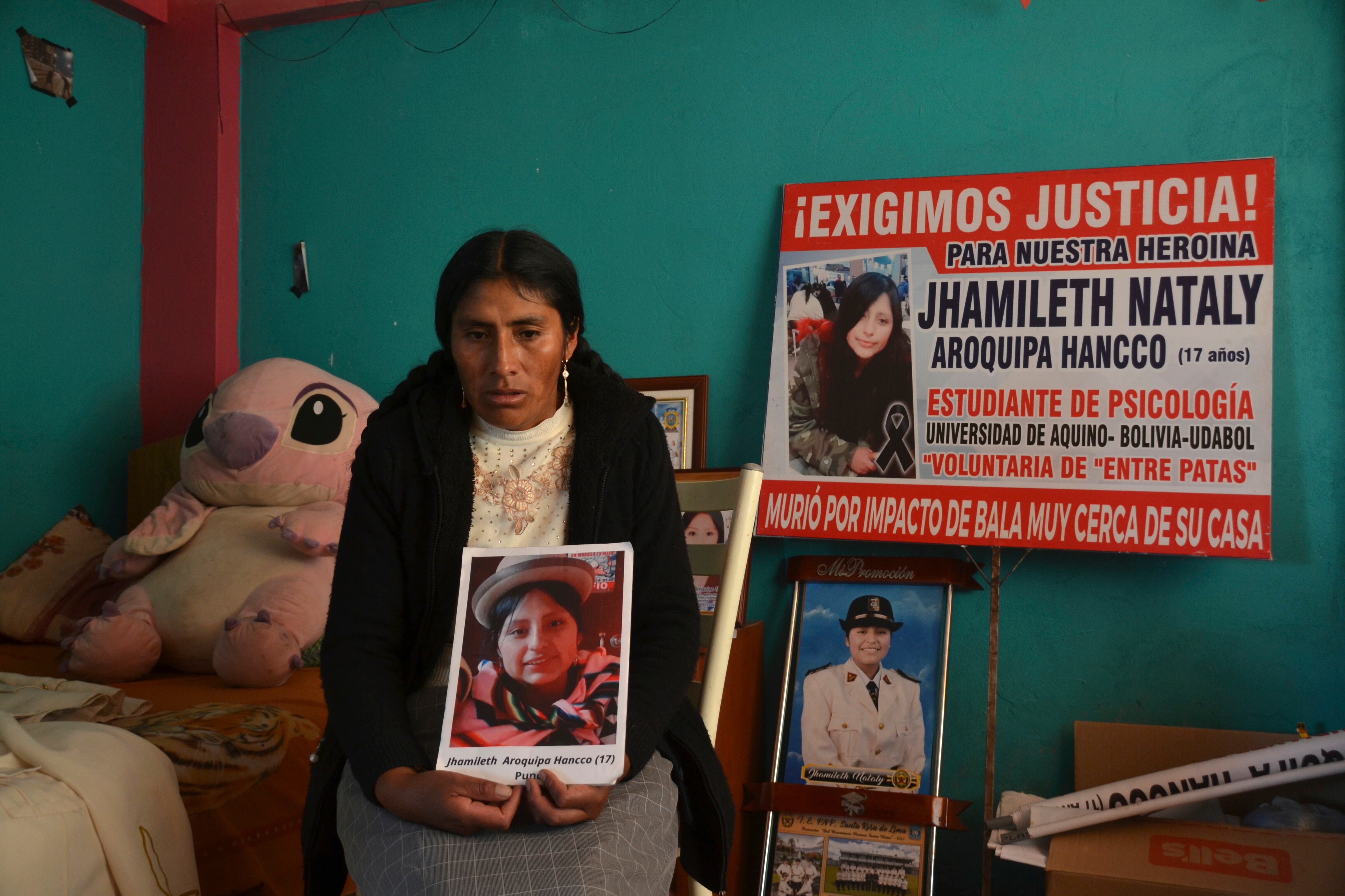 En su casa de Juliaca, Hancco continúa limpiando con frecuencia el cuarto de su hija Jhamileth donde están acumulados sus retratos, ropa, libros e incluso su peluche rosado favorito inspirado en el personaje ficticio Stitch, de la película “Lilo y Stitch” de Disney. También un letrero donde dice “exigimos justicia”.