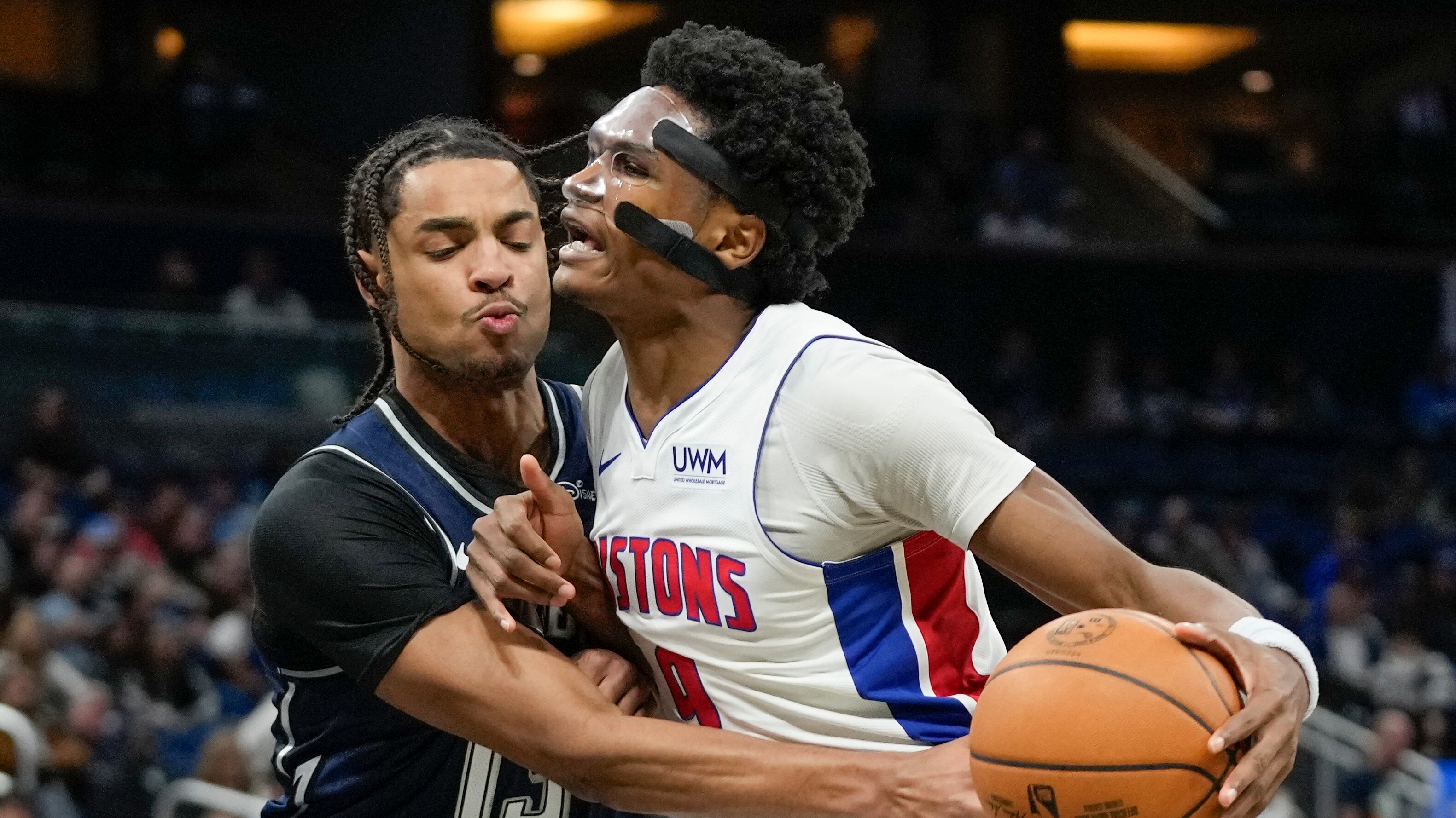 Ausar Thompson, derecha, alero de Pistons de Detroit, hace un movimiento para atacar la canasta frente a Jett Howard, escolta del Magic de Orlando, durante la segunda mitad del juego de baloncesto de la NBA, el viernes 8 de diciembre de 2023, en Orlando, AP (John Raoux/AP)