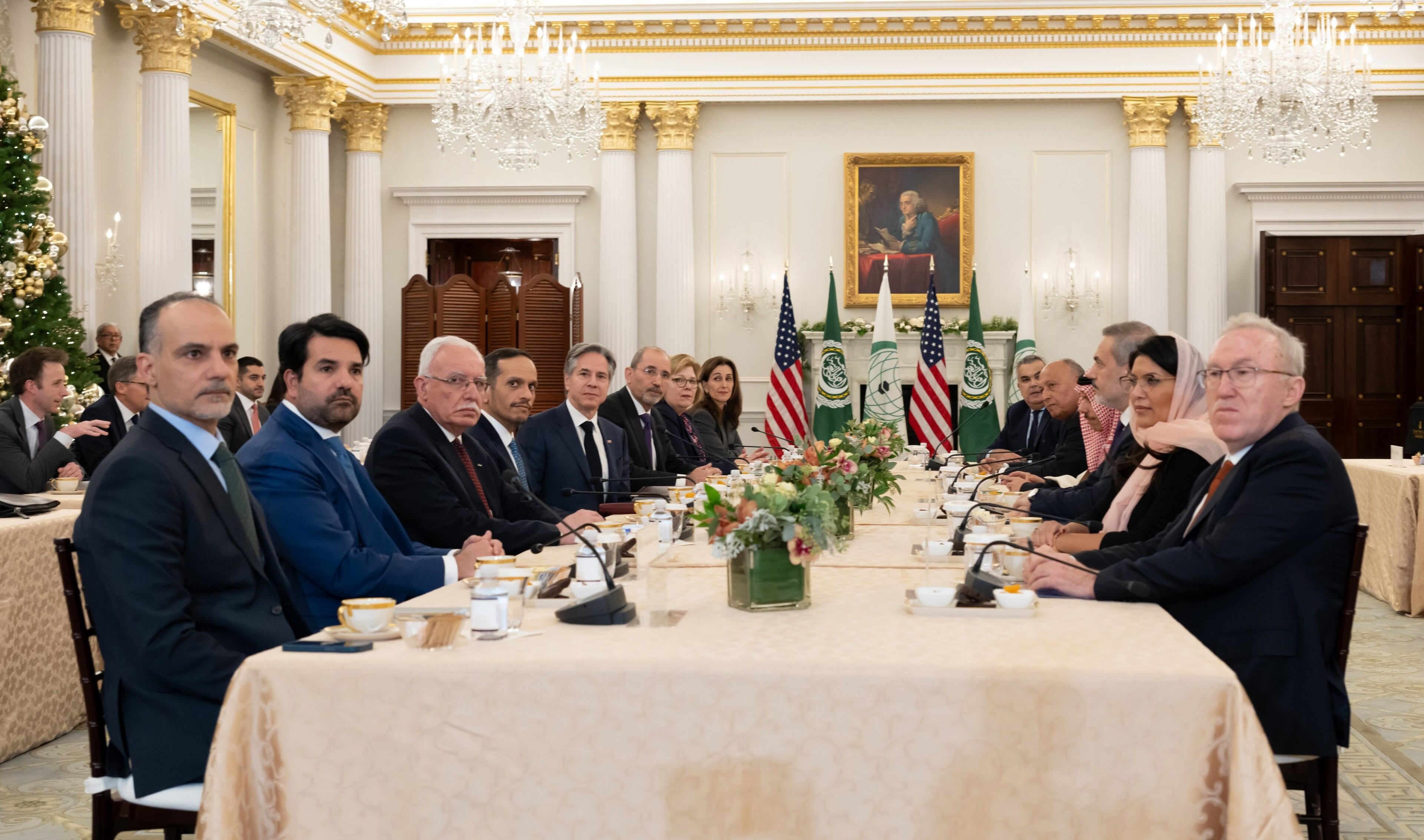 Los asistentes, excepto Blinken, "expresaron también su decepción por el fracaso del Consejo de Seguridad de la ONU, por segunda vez, a la hora de votar una resolución para un alto el fuego inmediato en la Franja de Gaza por razones humanitarias, después de que Estados Unidos utilizara su poder de veto".