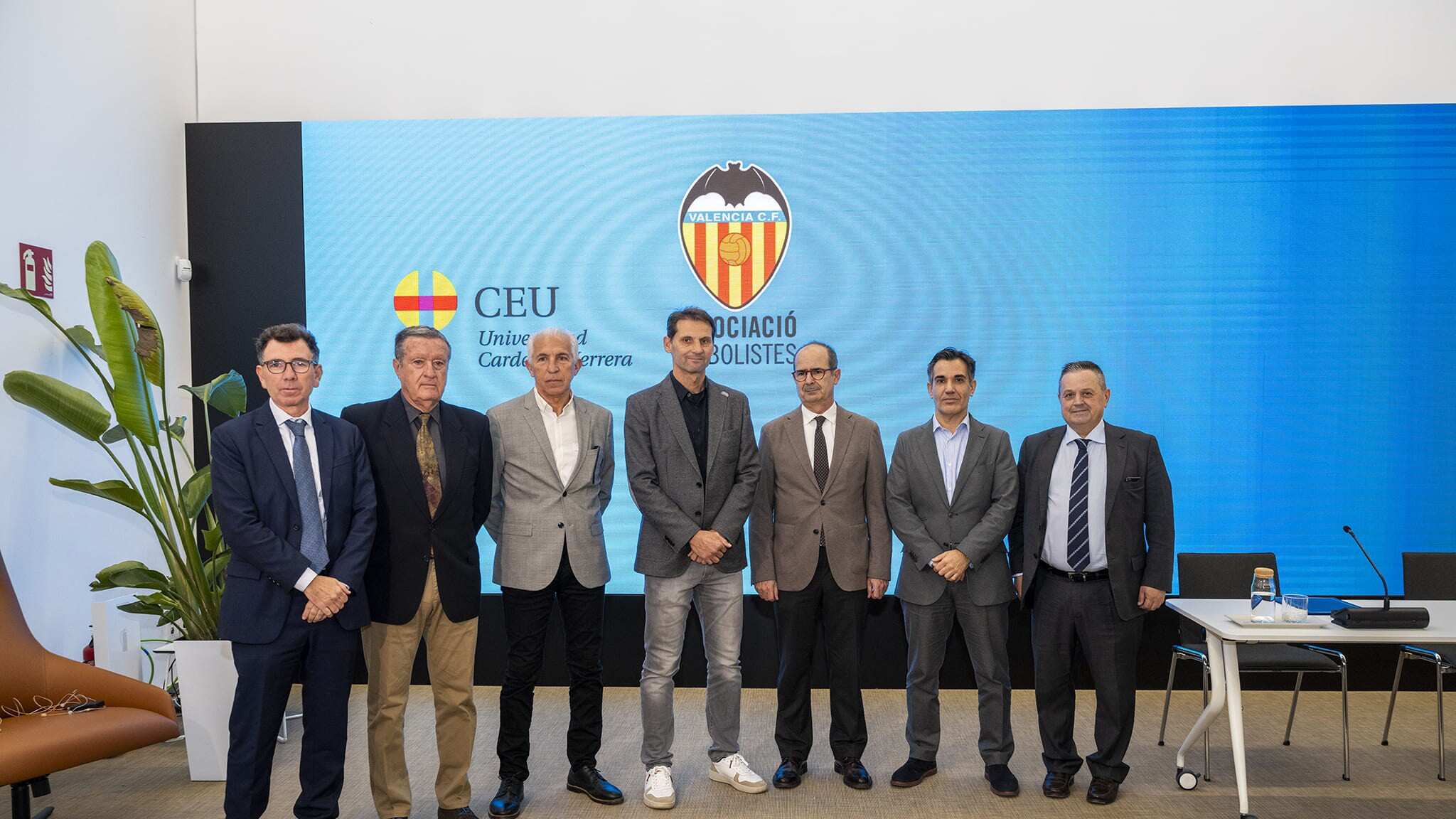 A la firma del convenio han asistido el presidente de la Asociación de Futbolistas del Valencia CF, el exfutbolista Fernando Giner, y el rector de la CEU UCH, Higinio Marín, junto a Francisco Sánchez y Óscar Cortijo, gerente y responsable del Servicio de personas de la institución universitaria, respectivamente.